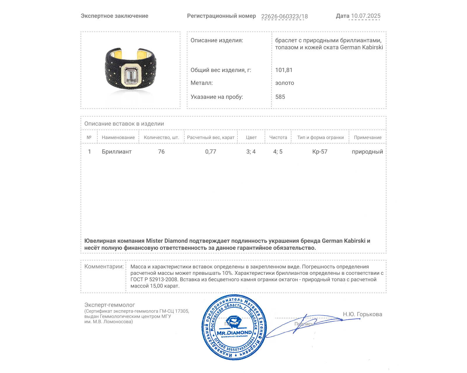 Представляем вашему вниманию оригинальный золотой браслет с кожей ската, топазом 15.00ct и бриллиантами 0.77ct от всемирно известного бренда German Kabirski.
