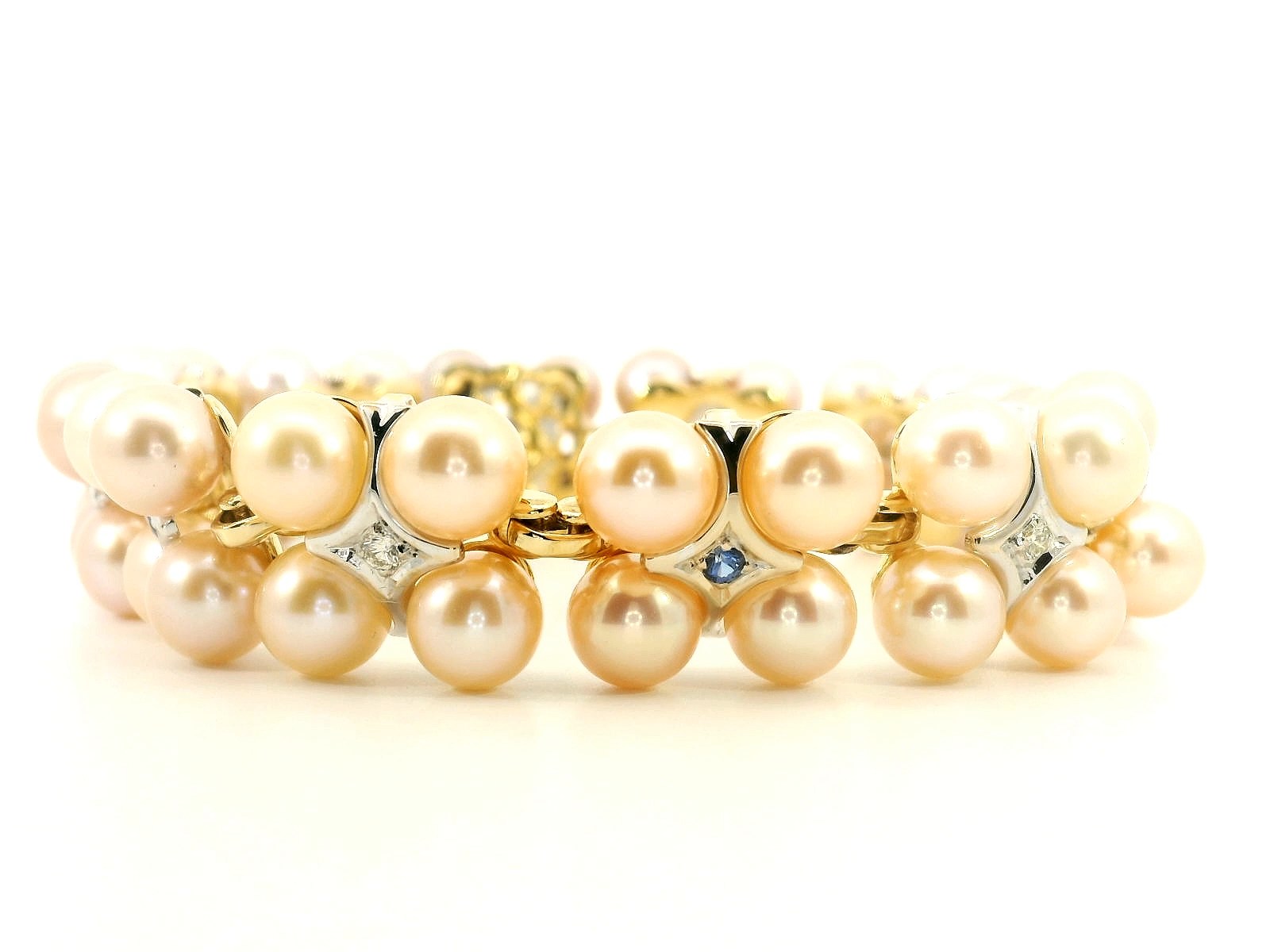 Представляем вашему вниманию золотой браслет с розовым жемчугом 6.70-6.80 мм, сапфирами 0.20ct и бриллиантами 0.24ct.