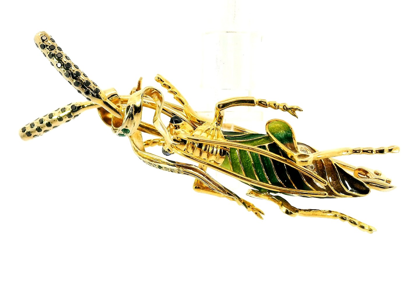 Представляем вашему вниманию оригинальную золотую брошь с эмалью, сапфирами 0.06ct, изумрудами 0.10ct, бесцветными 0.10ct и черными 0.45ct бриллиантами от известного бренда Ананов.