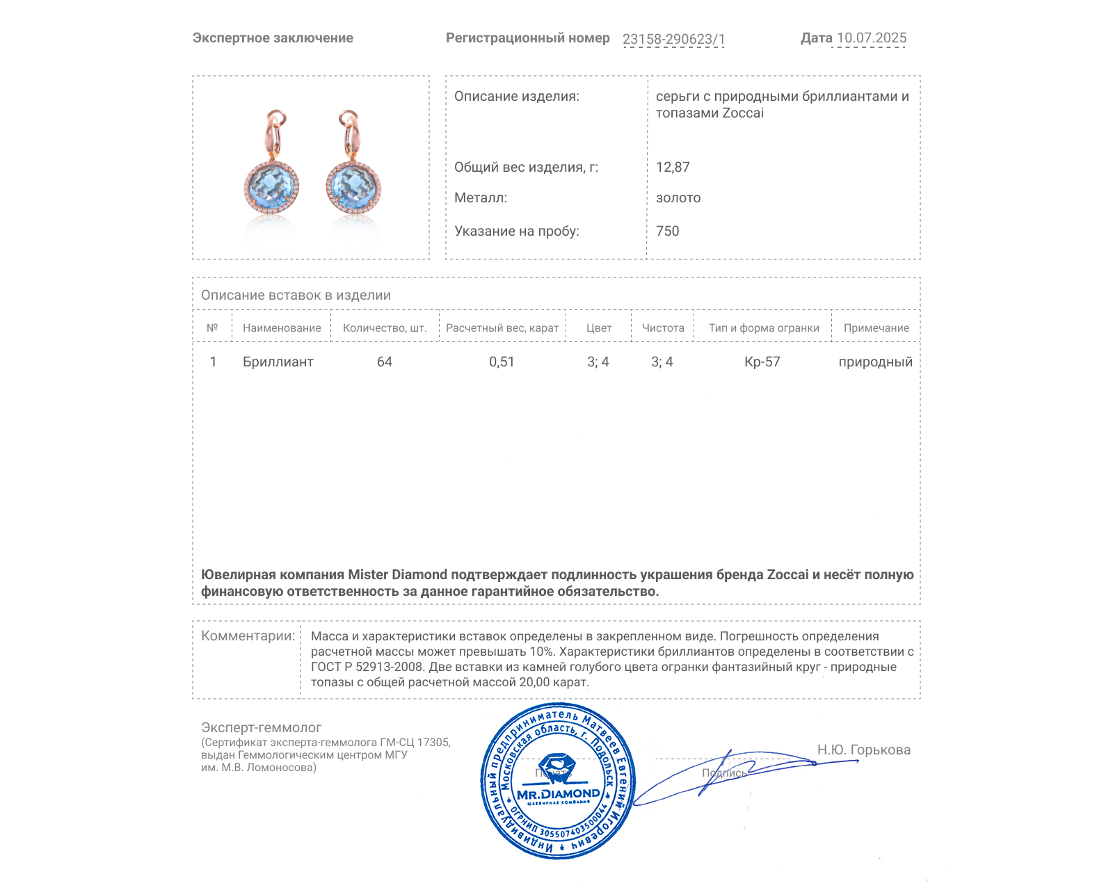 Представляем вашему вниманию оригинальные золотые серьги c голубыми топазами 20.00ct и бриллиантами 0.51ct от всемирно известного бренда Zoccai.