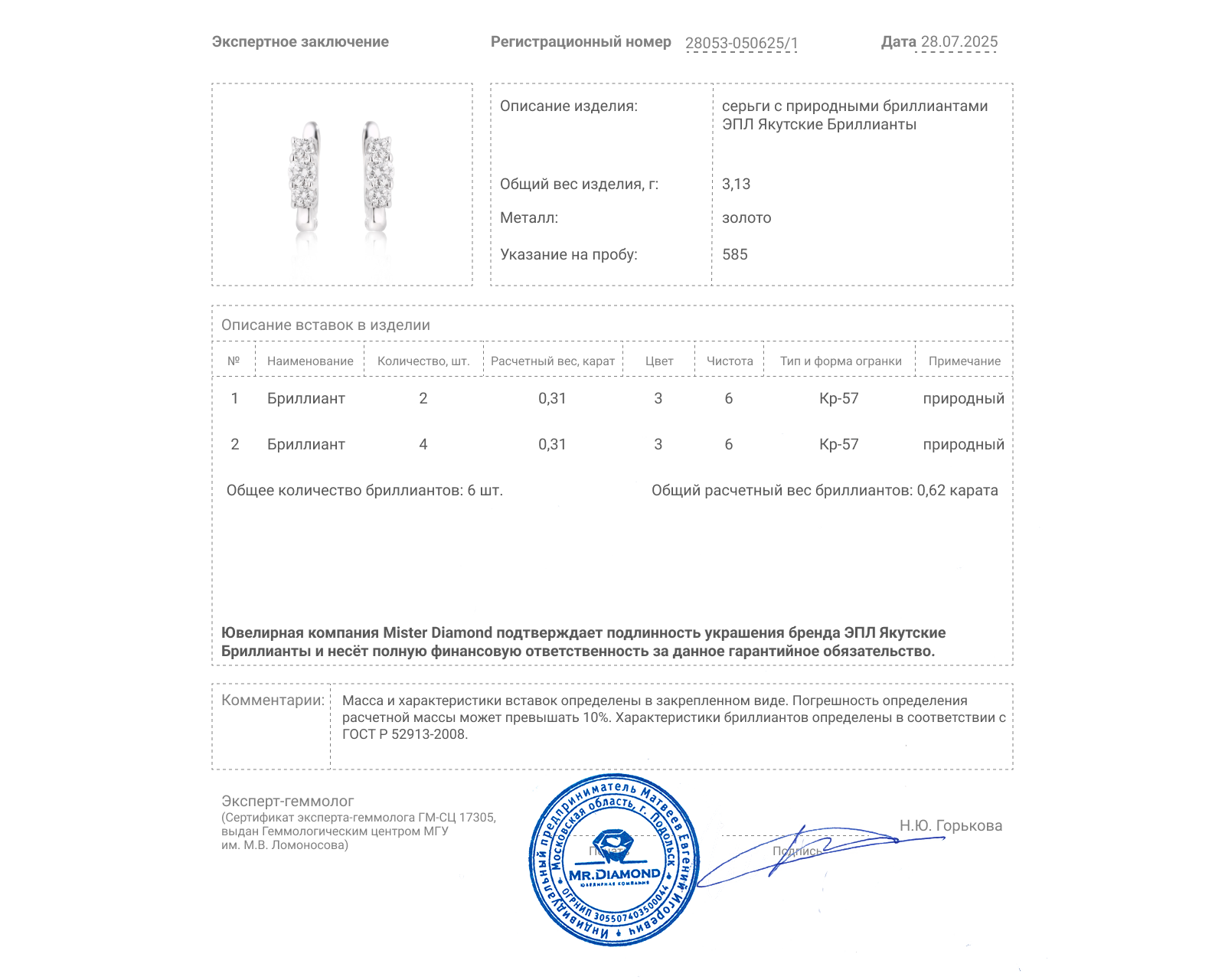 Представляем вашему вниманию оригинальные золотые серьги с бриллиантами 0.62ct от всемирно известного бренда ЭПЛ Якутские Бриллианты.
