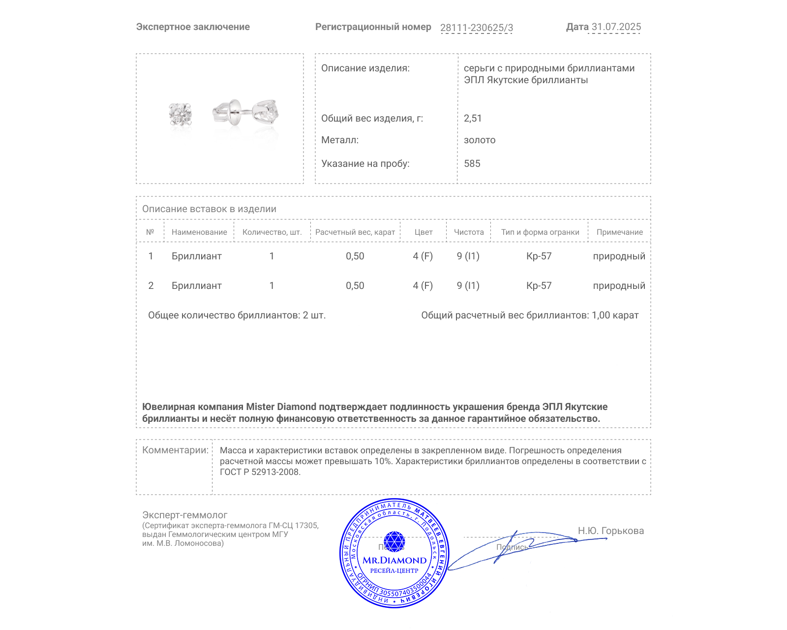 Представляем вашему вниманию оригинальные золотые серьги с бриллиантами 1.00ct от всемирно известного бренда ЭПЛ Якутские бриллианты.