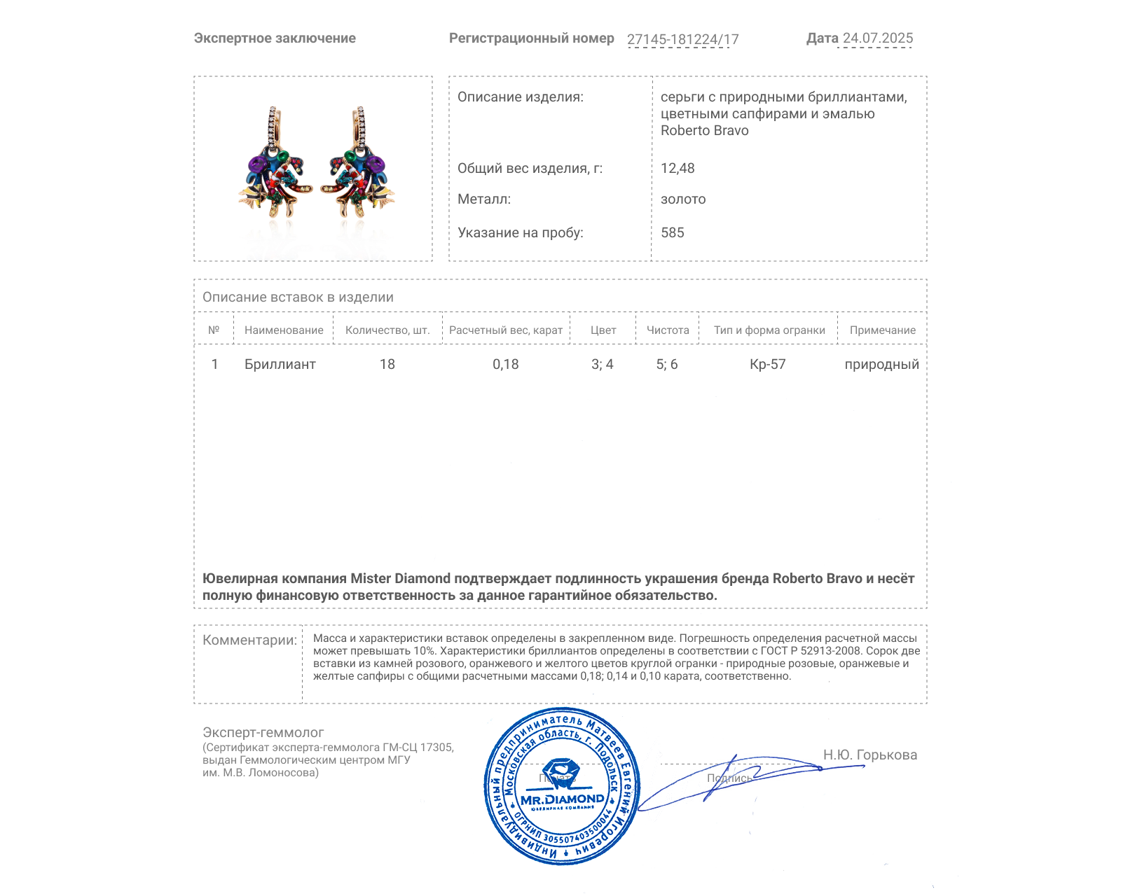 Представляем вашему вниманию оригинальные золотые серьги с эмалью, розовыми 0.18ct, оранжевыми 0.14ct и желтыми 0.10ct сапфирами и бриллиантами 0.18ct от всемирно известного бренда Roberto Bravo из коллекции Le Grand Bleu.
