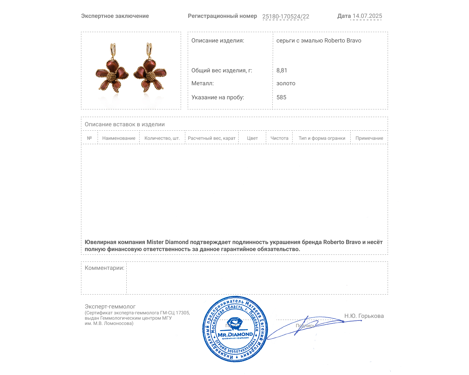 Оригинальные золотые серьги с эмалью Roberto Bravo 111222/12