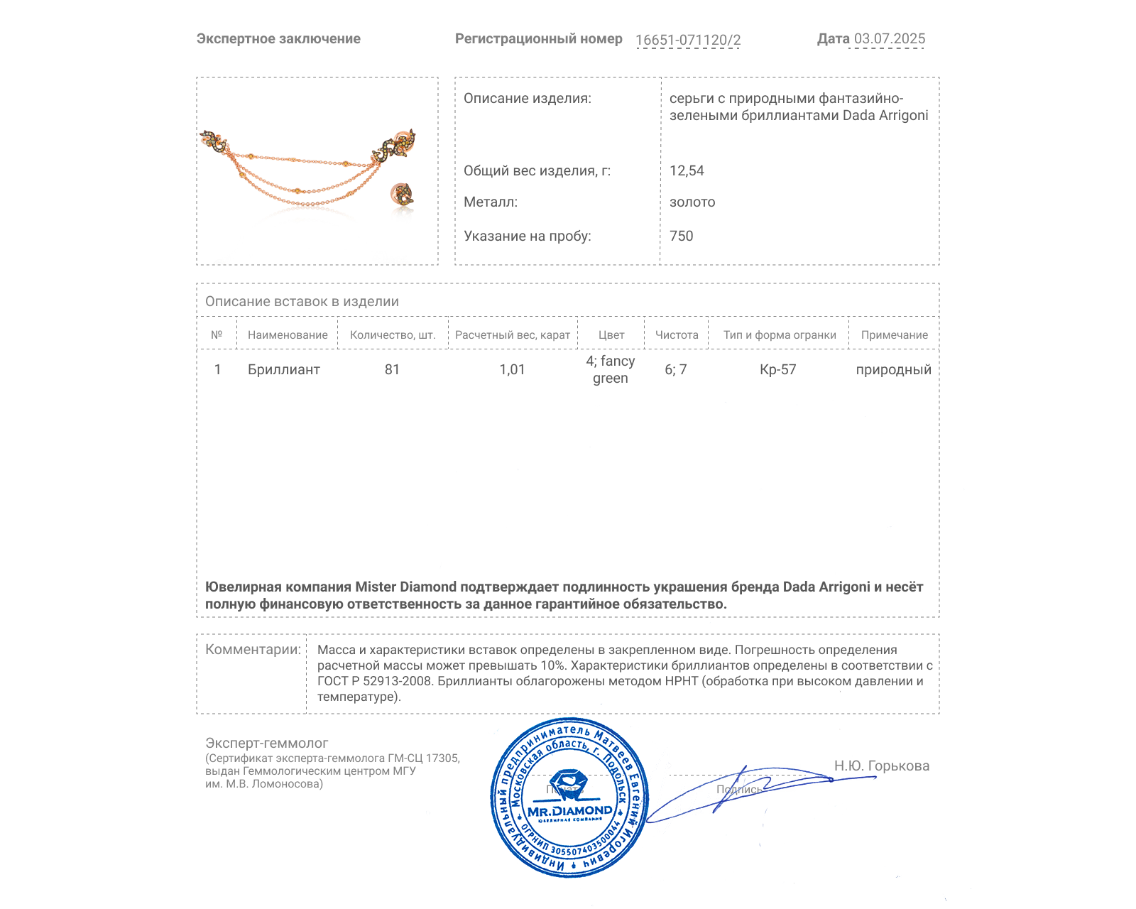 Представляем вашему вниманию оригинальные золотые серьги с фантазийными зелеными бриллиантами 1.01ct от всемирно известного бренда Dada Arrigoni.