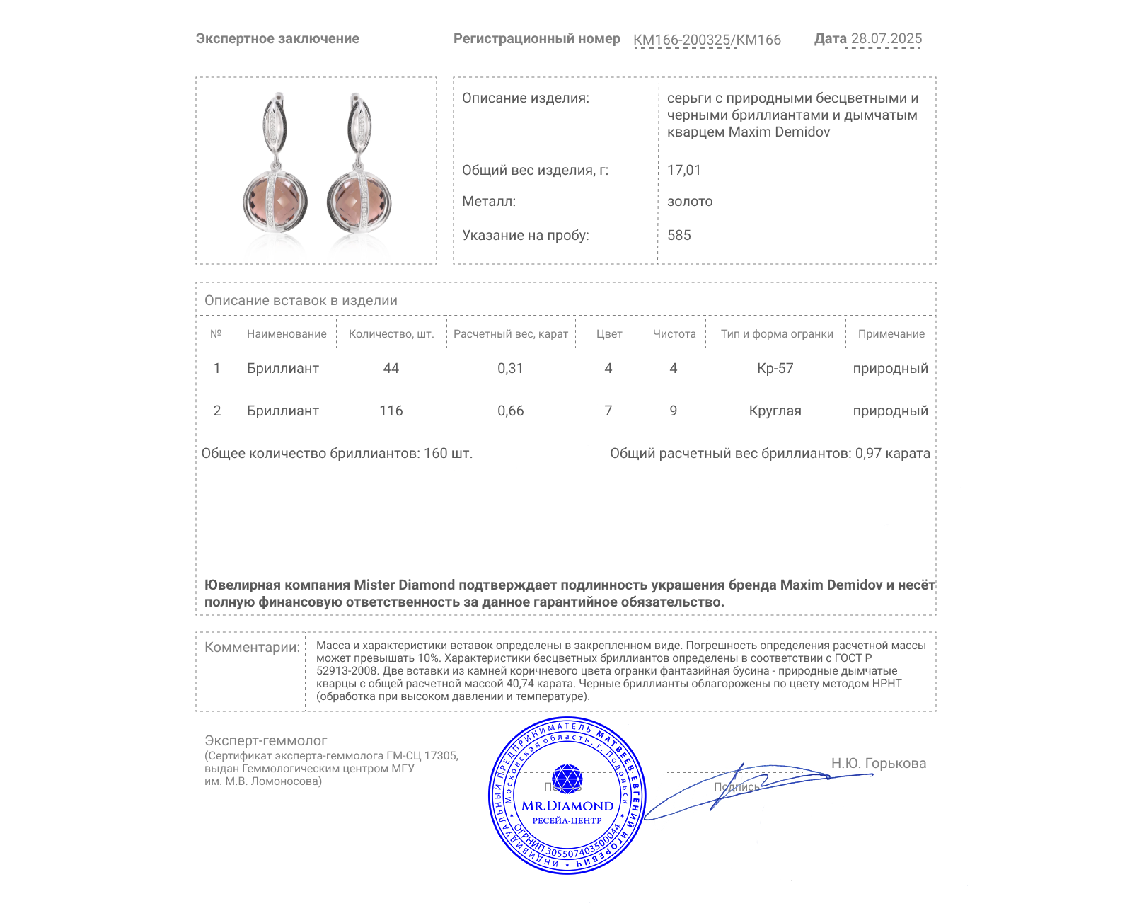 Представляем вашему вниманию оригинальные золотые серьги с дымчатым кварцем 40.74ct, бесцветными 0.31ct и черными 0.66ct бриллиантами от всемирно известного бренда Maxim Demidov.