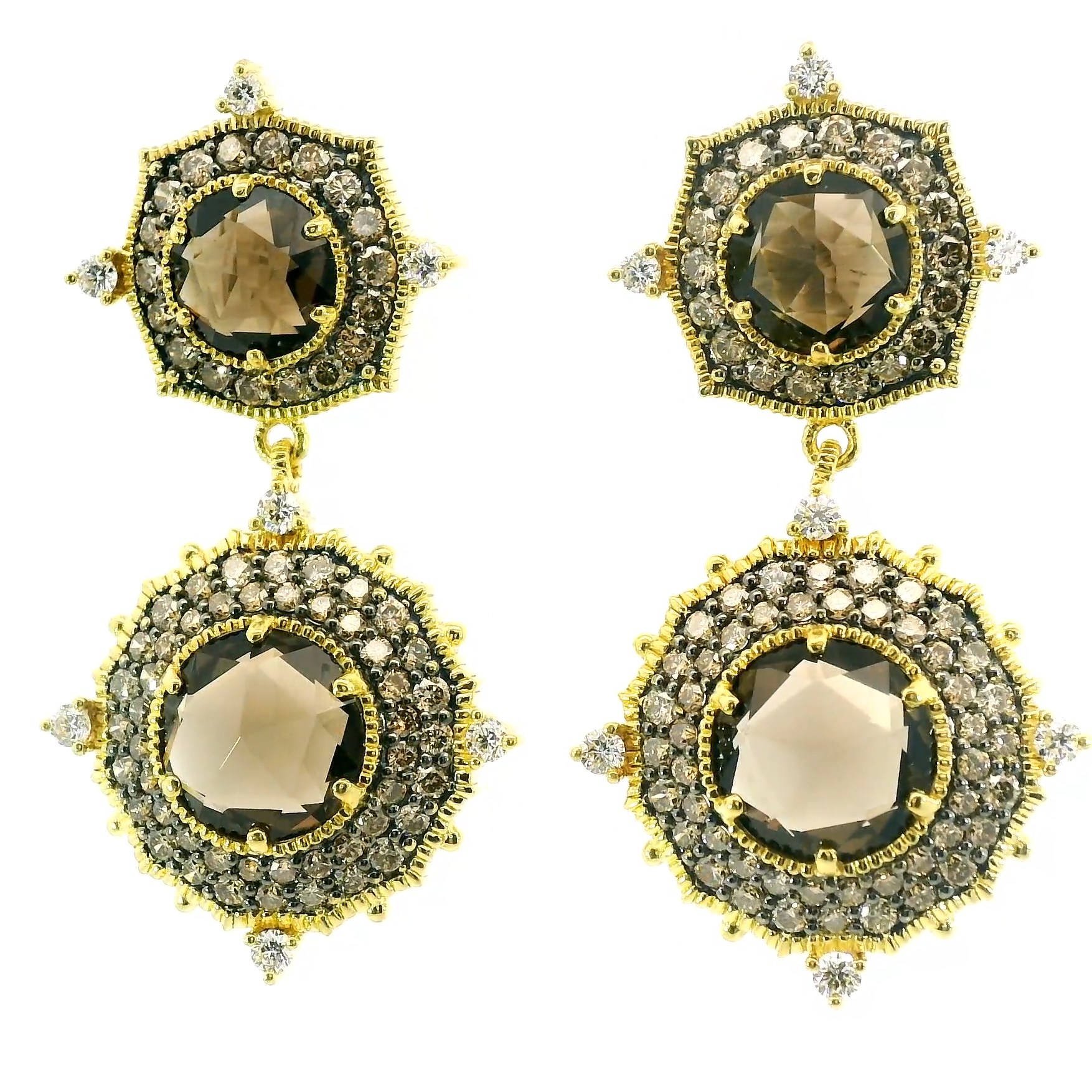Представляем вашему вниманию оригинальные золотые серьги с дымчатым кварцем 8.50ct, бесцветными 0.42ct и коньячными 2.70ct бриллиантами от всемирно известного бренда Judith Ripka.