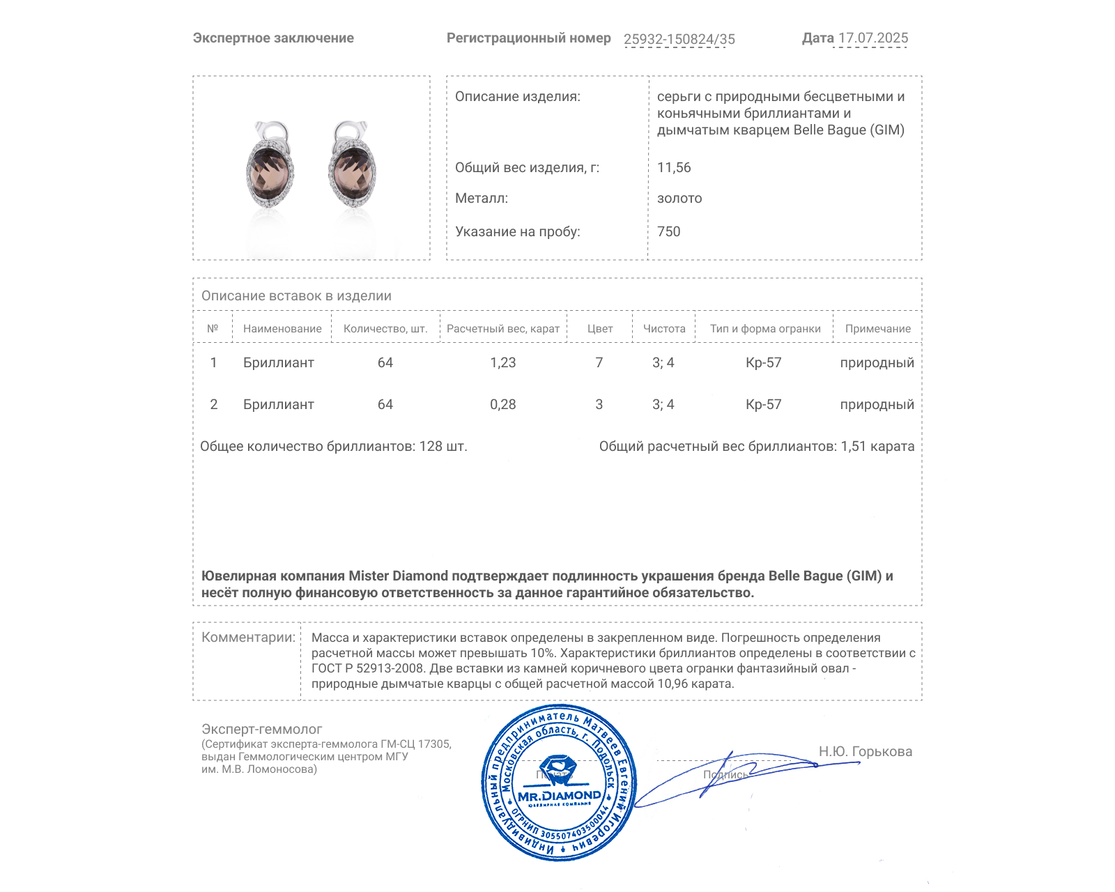 Представляем вашему вниманию оригинальные золотые серьги с дымчатым кварцем 10.96ct, коньячными 1.23ct и бесцветными 0.28ct бриллиантами от всемирно известного бренда Belle Bague (GIM).