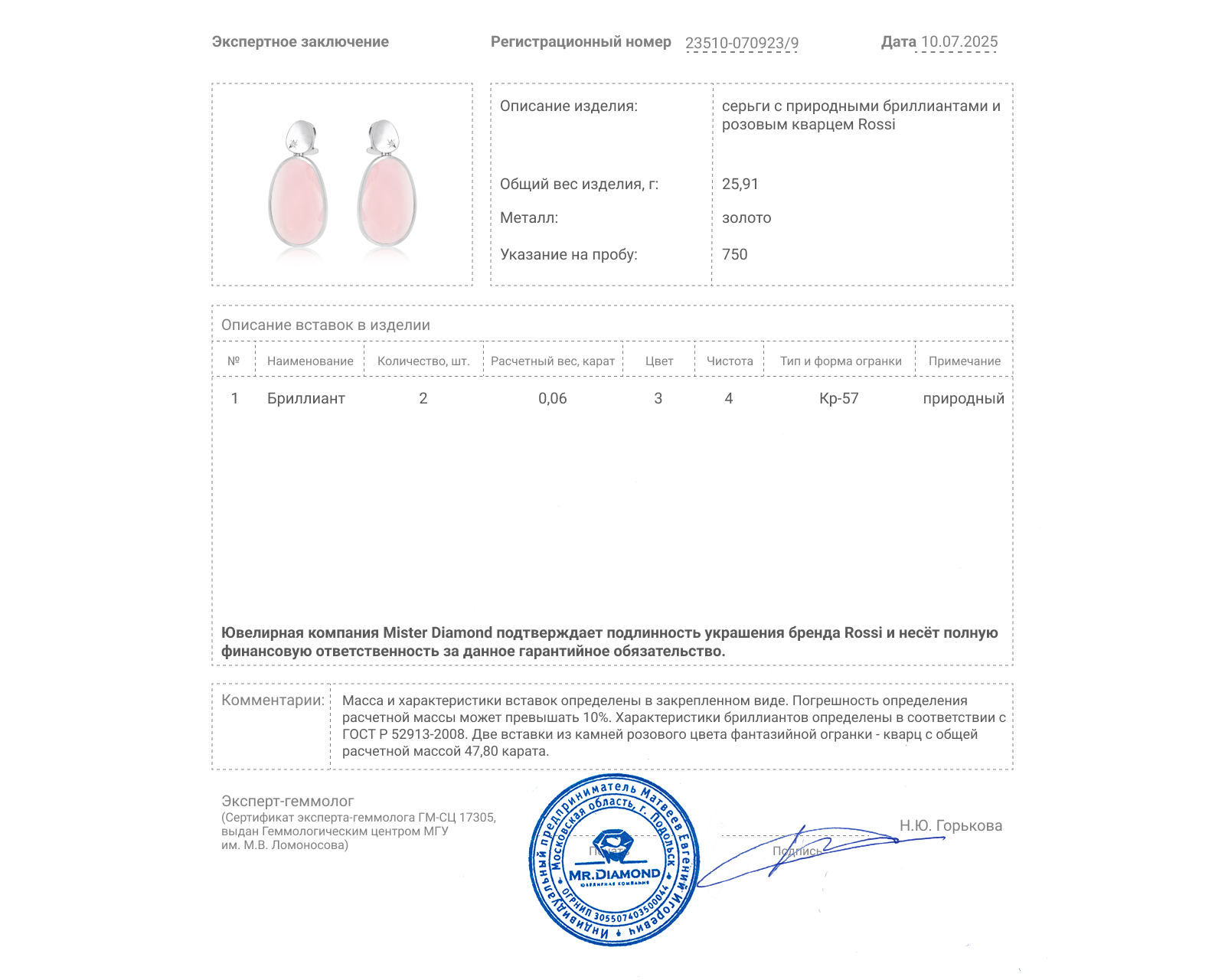 Представляем вашему вниманию оригинальные золотые серьги с розовым кварцем 47.80ct и бриллиантами 0.06ct от всемирно известного бренда Rossi.