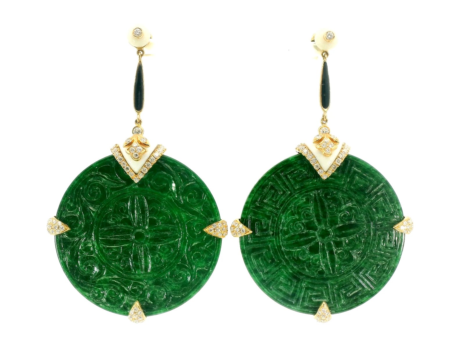 Представляем вашему вниманию оригинальные золотые серьги с нефритом 45.60ct, белыми 1.60ct ониксами и бриллиантами 1.05ct от всемирно известного бренда L. Borgee.