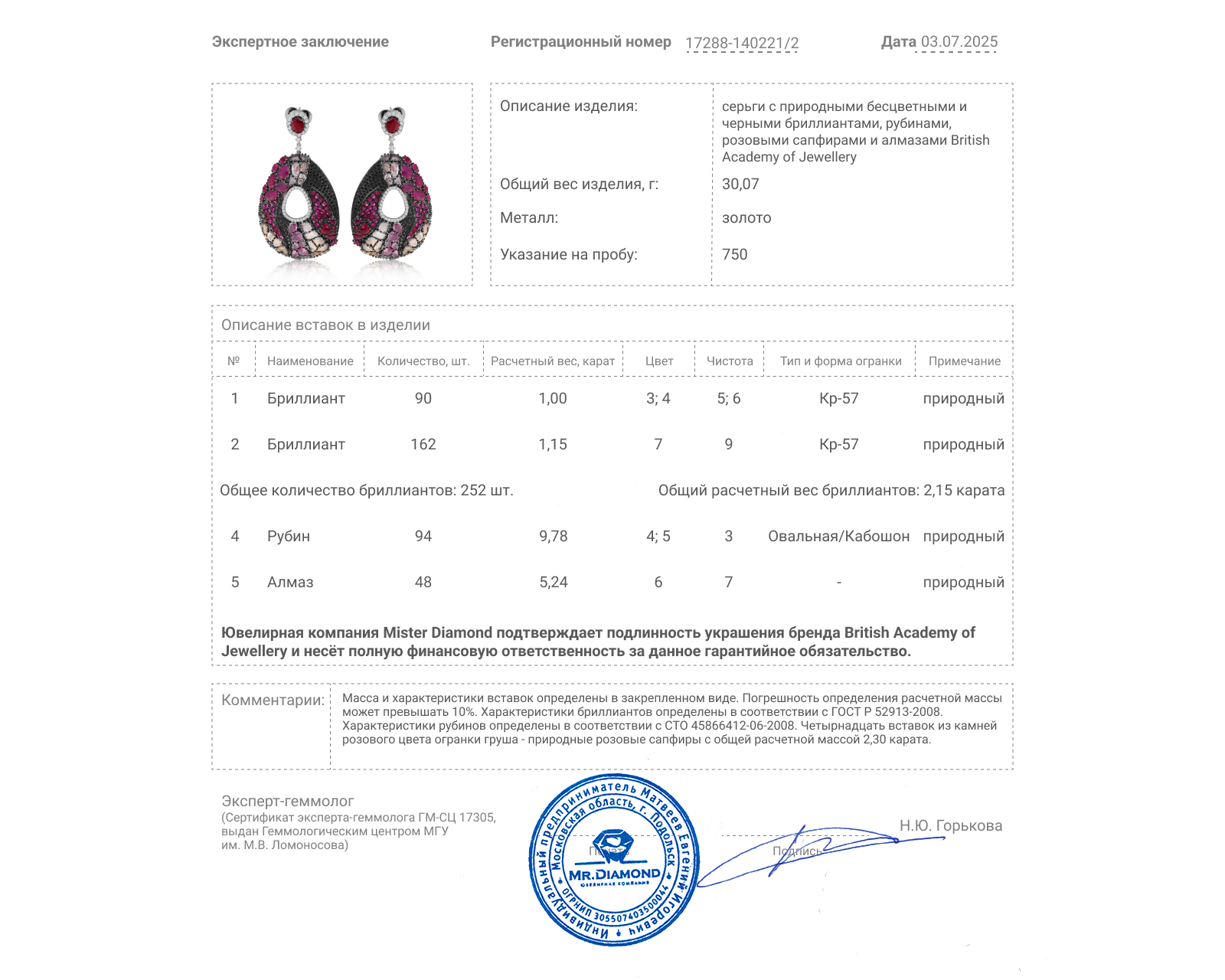 Представляем вашему вниманию оригинальные золотые серьги с рубинами 9.78ct, розовыми сапфирами 2.90ct, белыми 1.00ct и черными 1.15ct бриллиантами и алмазами 5.25ct от всемирно известного бренда British Academy of Jewellery.