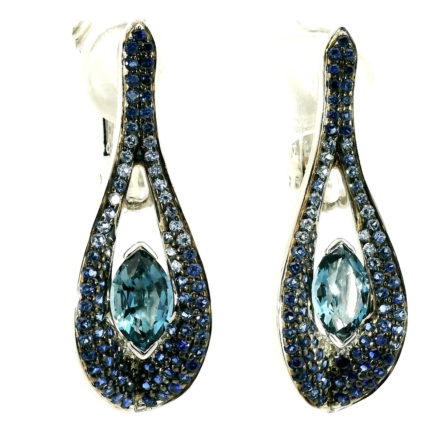 Представляем вашему вниманию оригинальные золотые серьги с топазами London Blue 1.80ct, сапфирами 1.01ct и бриллиантами 0.04ct от всемирно известного бренда Belle Bague (GIM).