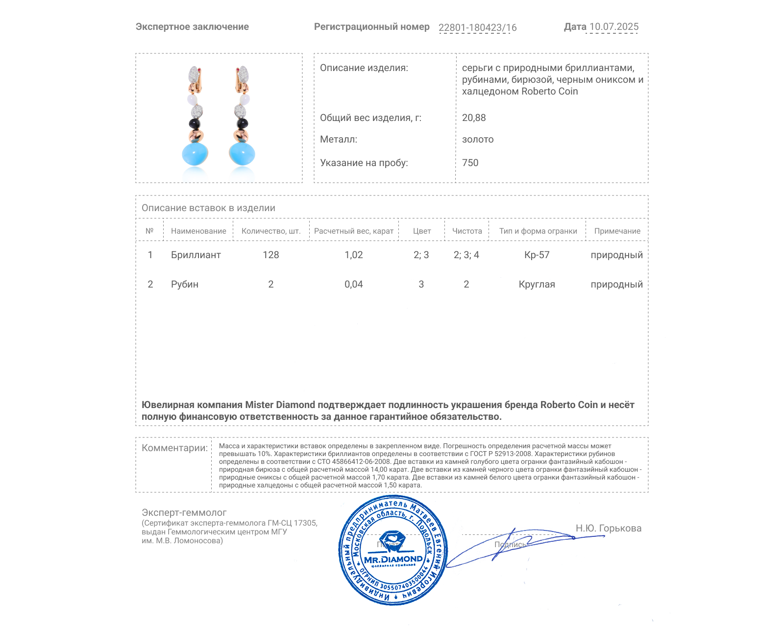 Представляем вашему вниманию оригинальные золотые серьги с бирюзой 14.00ct, черным ониксом 1.70ct, халцедонами 1.50ct, рубинами 0.04ct и бриллиантами 1.02ct от всемирно известного бренда Roberto Coin из коллекции Ikebana.