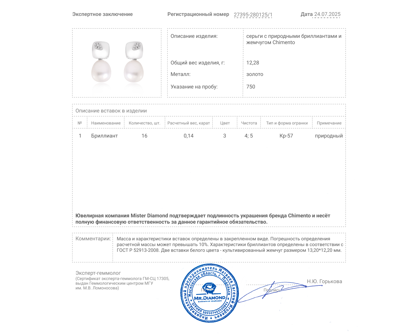 Представляем вашему вниманию оригинальные золотые серьги с жемчугом 13.20*12.20 мм и бриллиантами 0.14ct от всемирно известного бренда Chimento из коллекции Solo Mia.