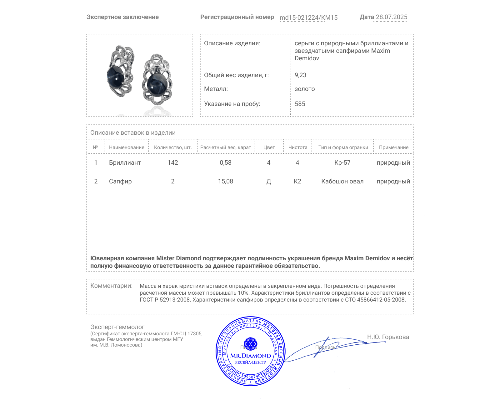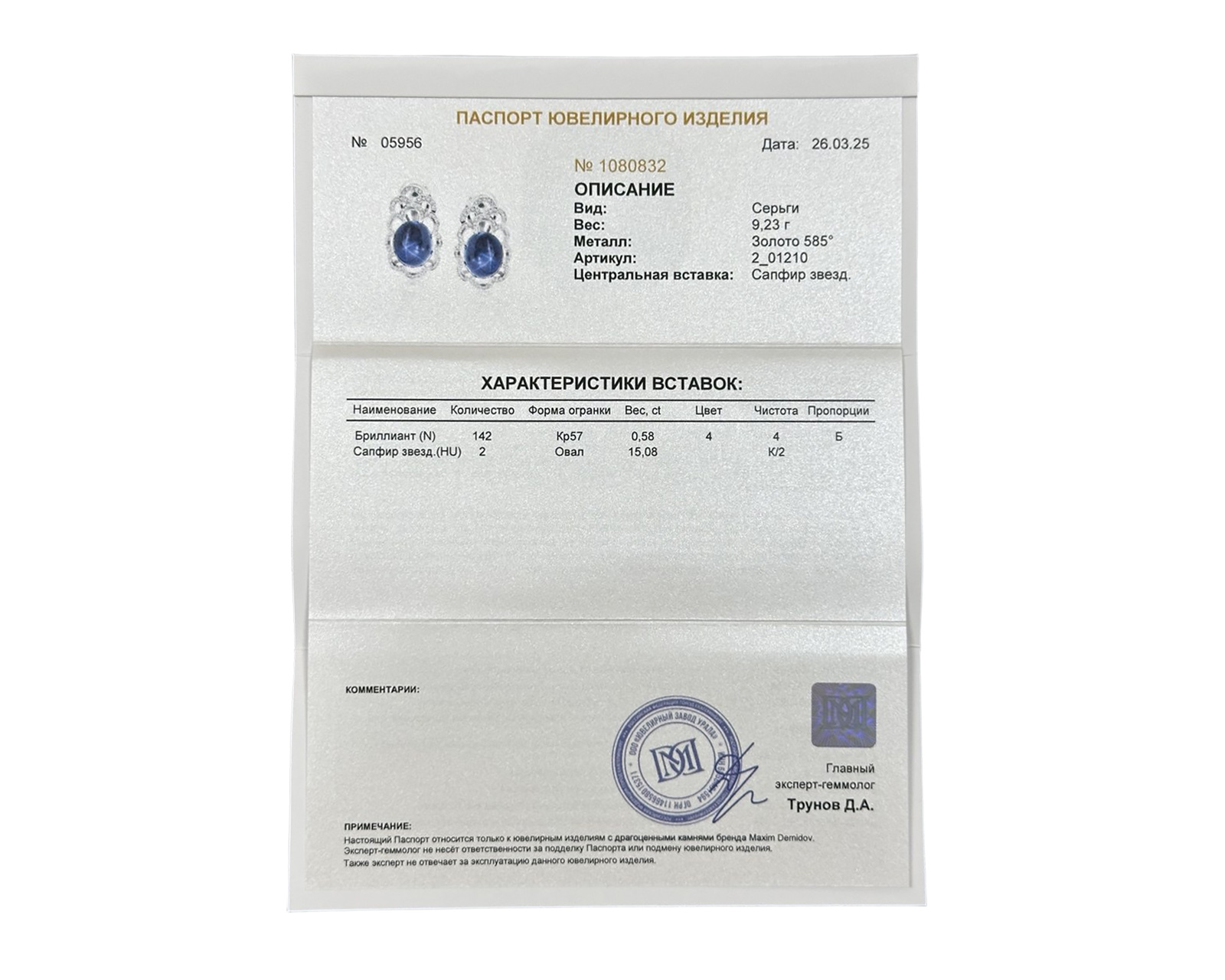 Представляем вашему вниманию оригинальные золотые серьги со звездчатыми сапфирами 15.08ct и бриллиантами 0.58ct от всемирно известного бренда Maxim Demidov.
