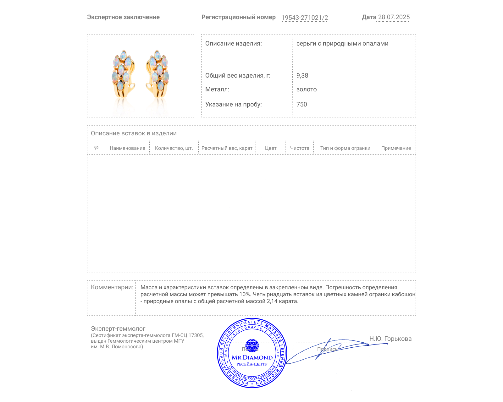 Вставки: 14 опалов огранки "кабошон" 2.14ct