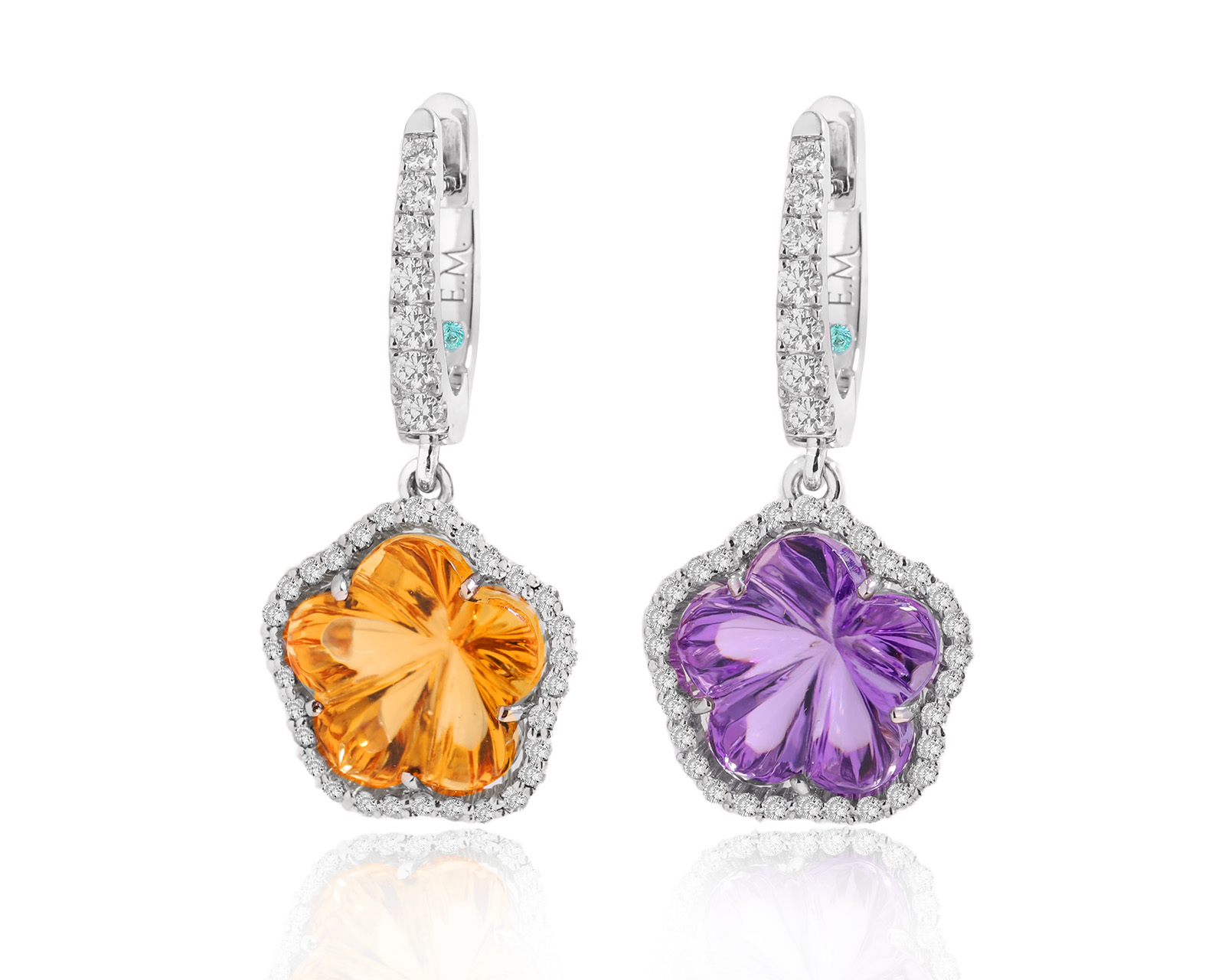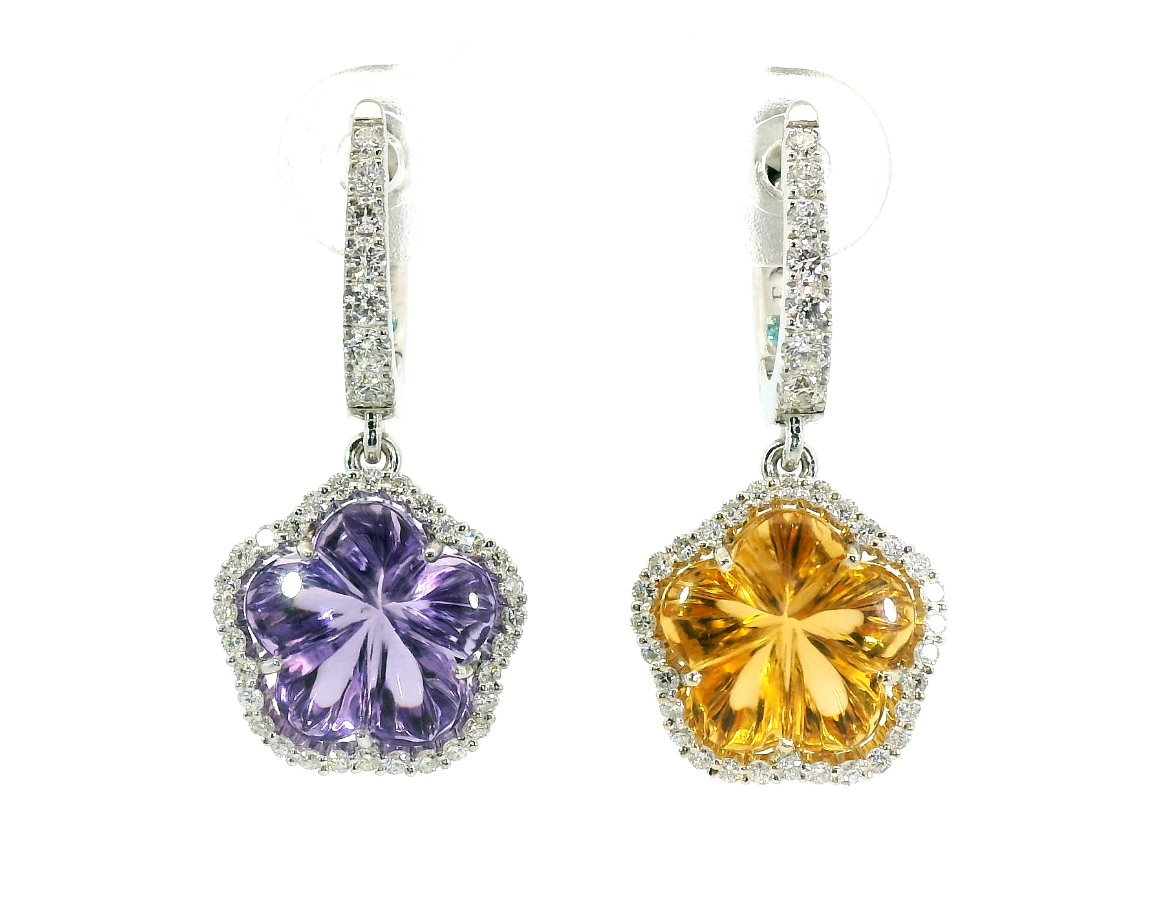 Представляем вашему вниманию золотые серьги с аметистом 4.00ct, цитрином 4.00ct, бриллиантами 0.50ct и турмалинами параиба 0.02ct.