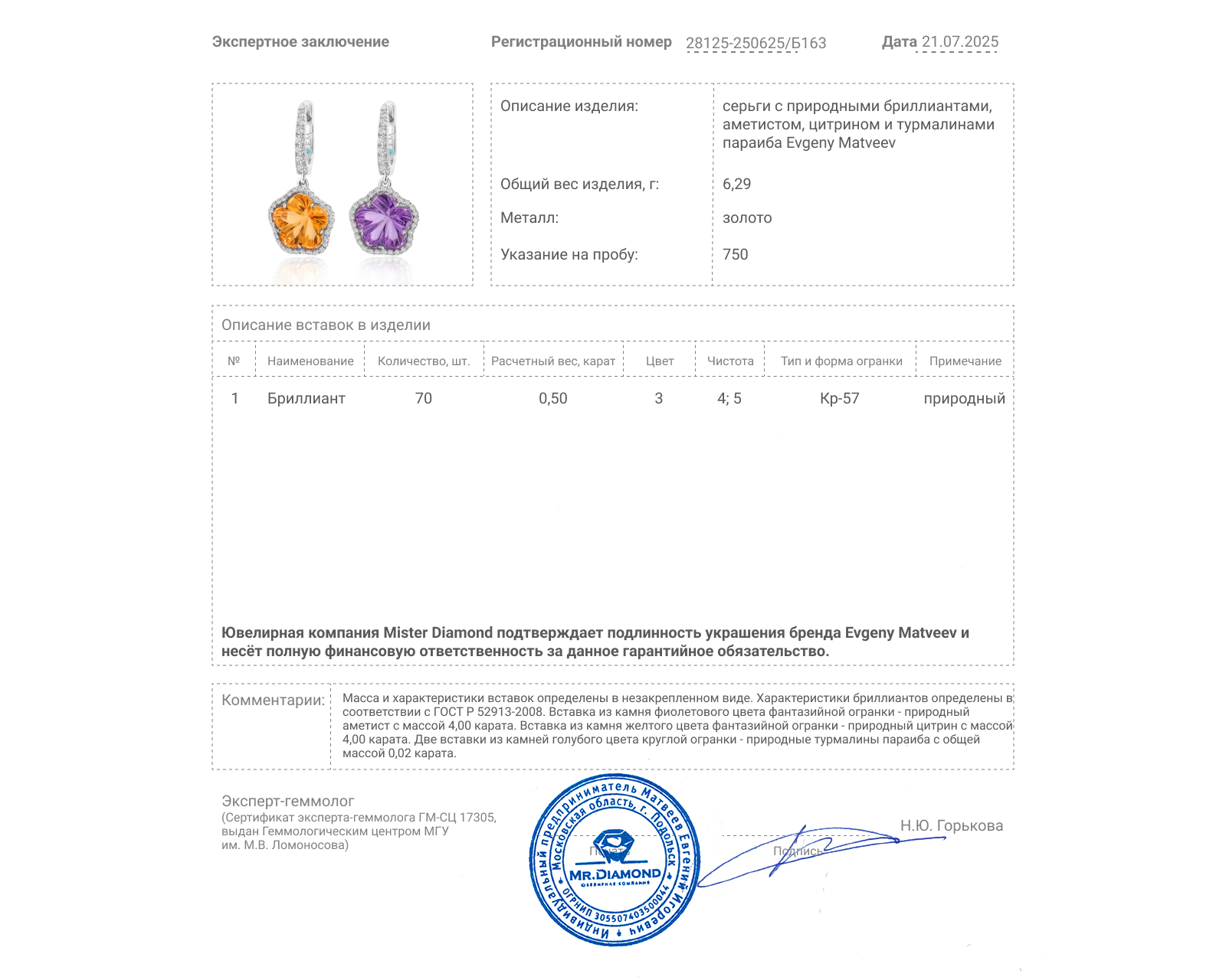 Золотые серьги с турмалинами 1.65ct и цитринами 10.59ct Evgeny Matveev 140325/Б112