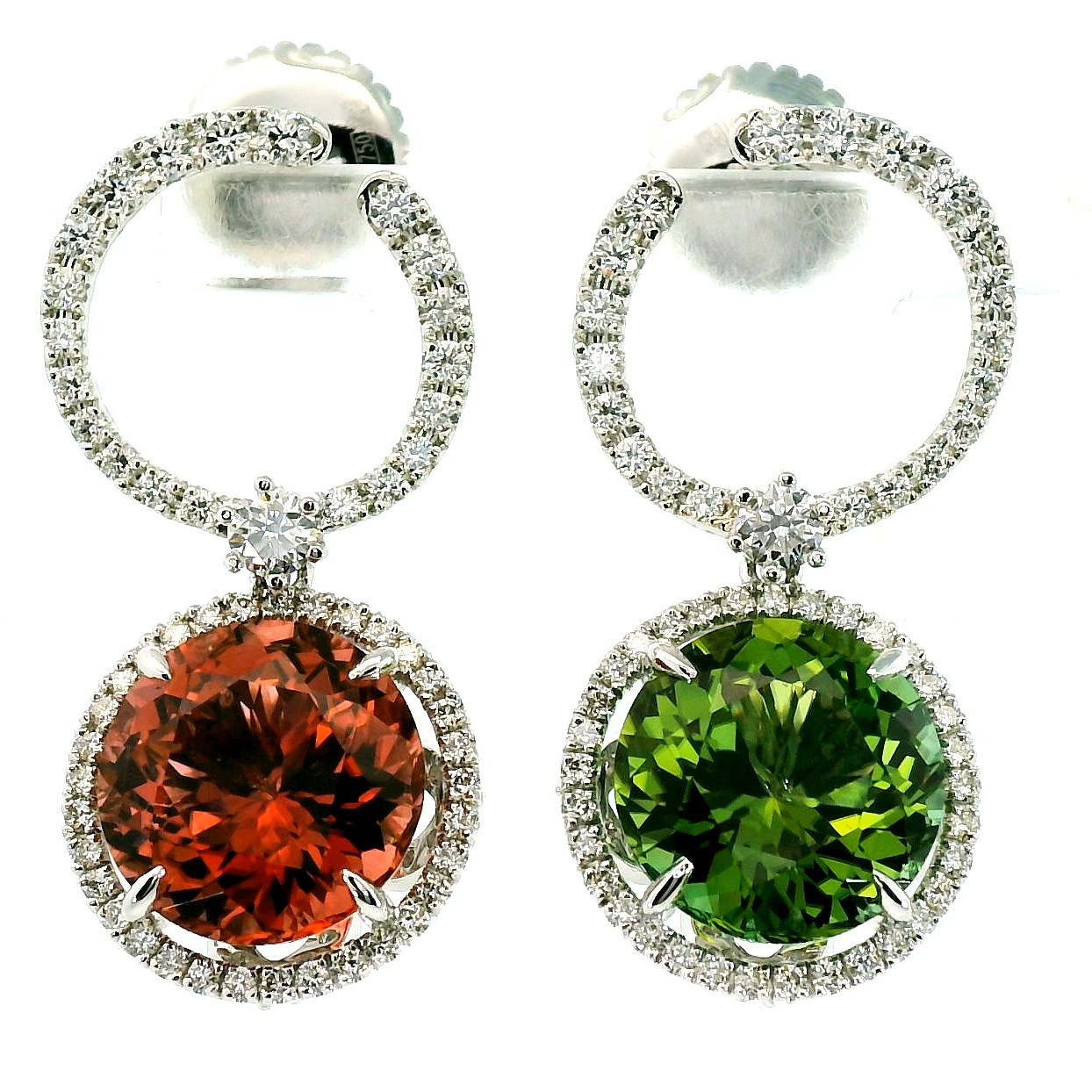 Представляем вашему вниманию золотые серьги с зеленым 3.67ct и розовым 3.59ct турмалинами, бриллиантами 1.43ct и турмалинами параиба 0.02ct.