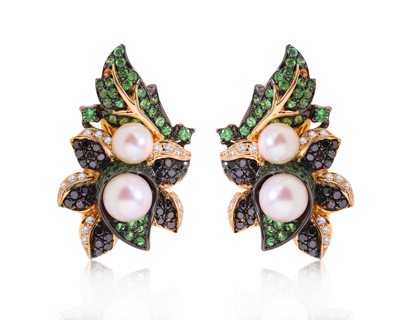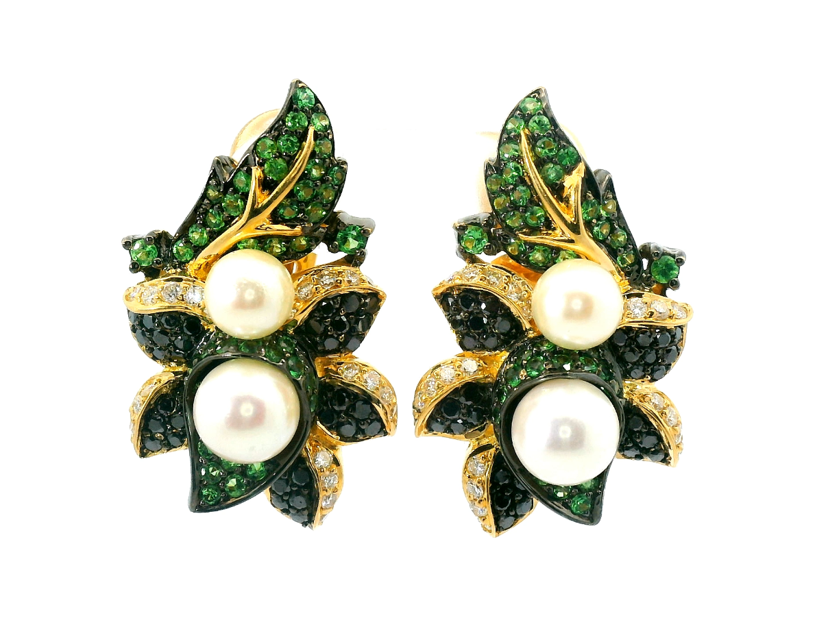 Представляем вашему вниманию золотые серьги с жемчугом 5.70-6.80 мм, тсаворитами 1.70ct, бесцветными 0.44ct и черными 0.65ct бриллиантами.