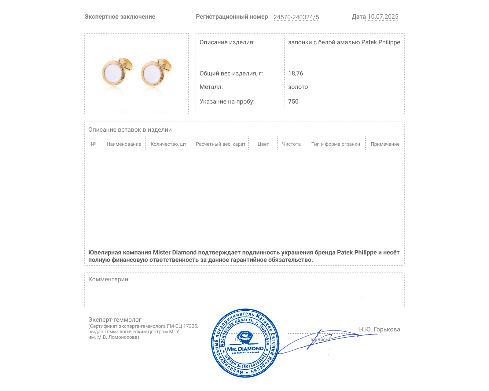 Оригинальные золотые запонки с эмалью Patek Philippe Calatrava 240324/7