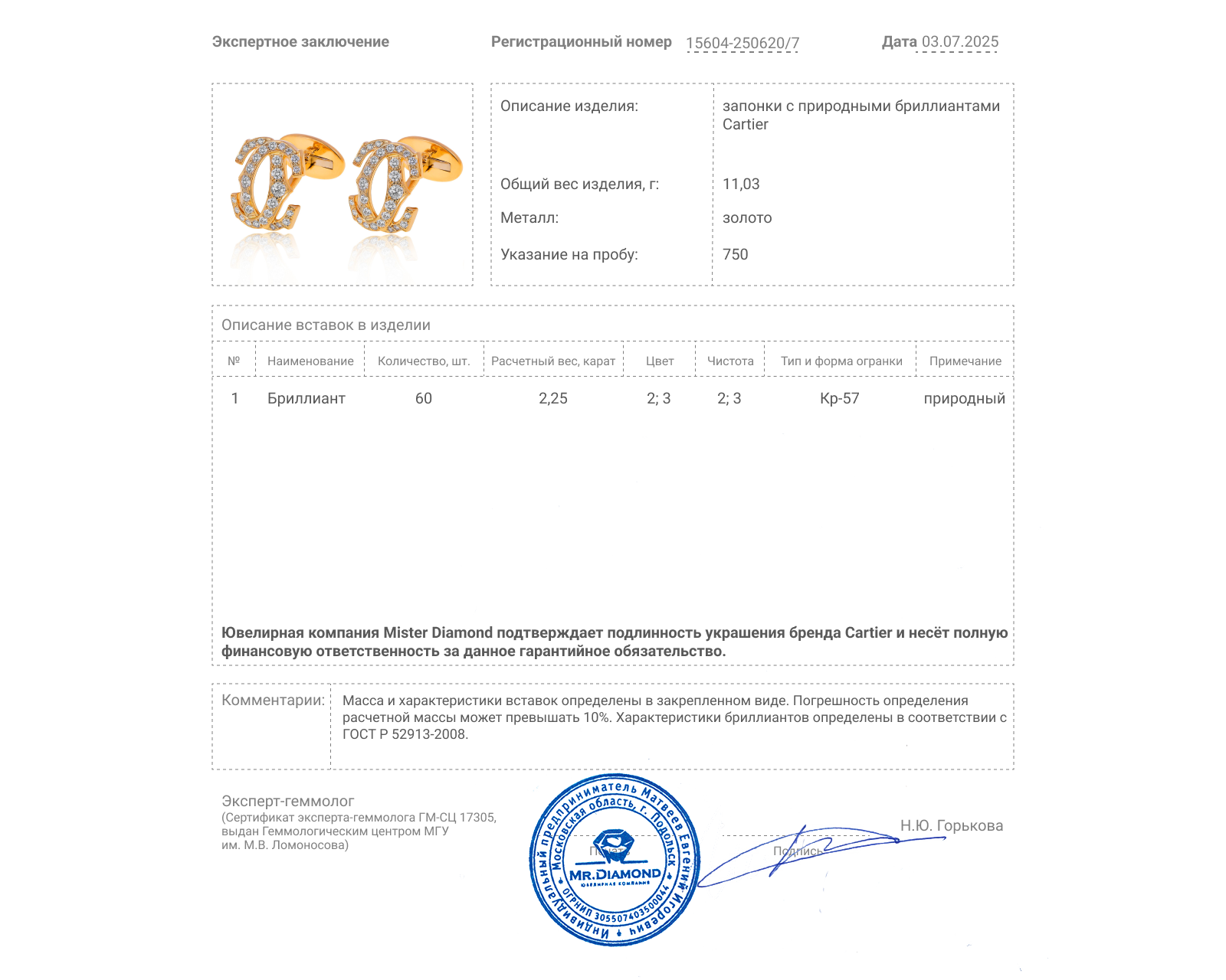 Вставки: 60 бриллиантов круглой огранки 2.25ct 2/2-3/3