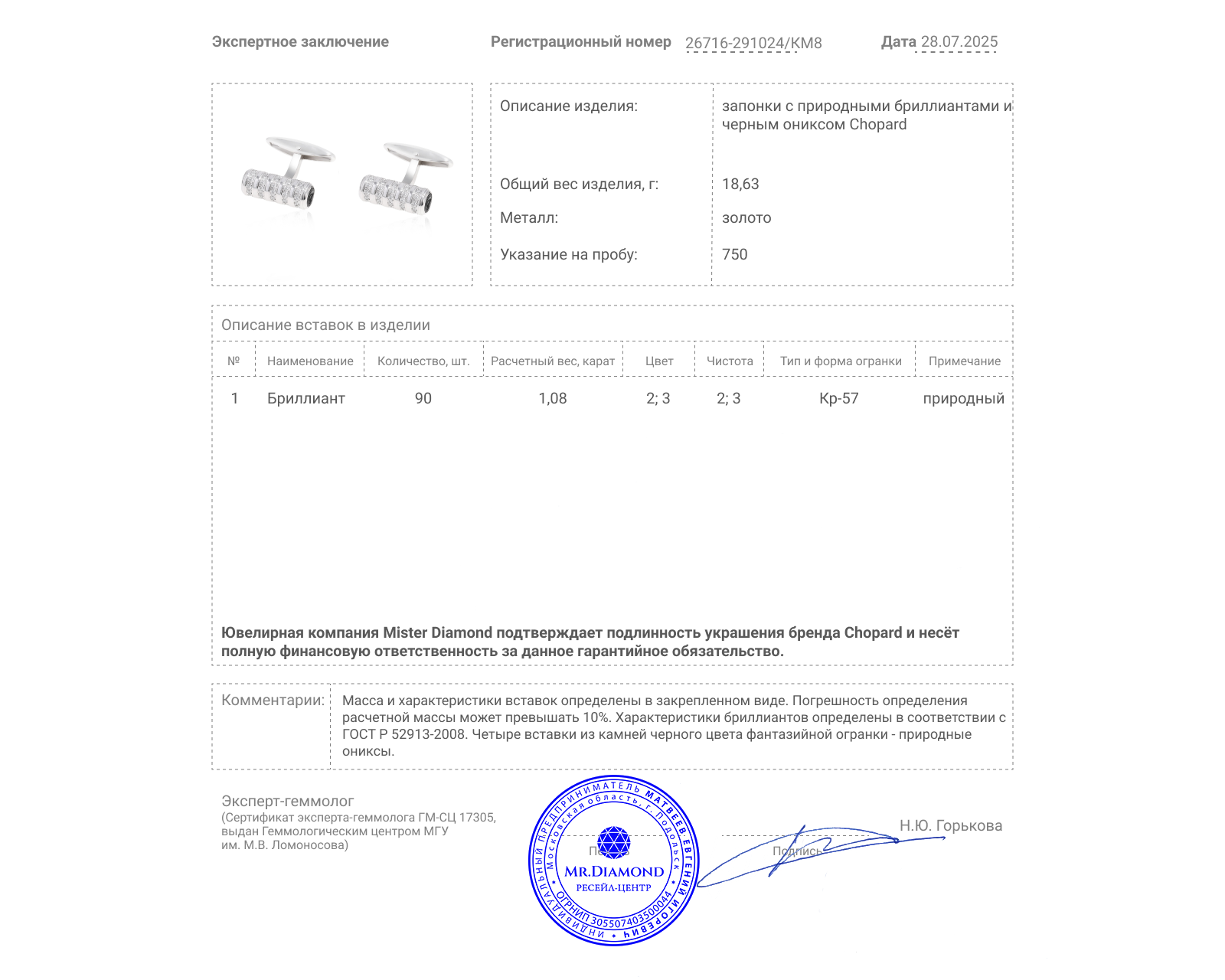 Представляем вашему вниманию оригинальные золотые запонки с черным ониксом и бриллиантами 1.08ct от всемирно известного бренда Chopard.