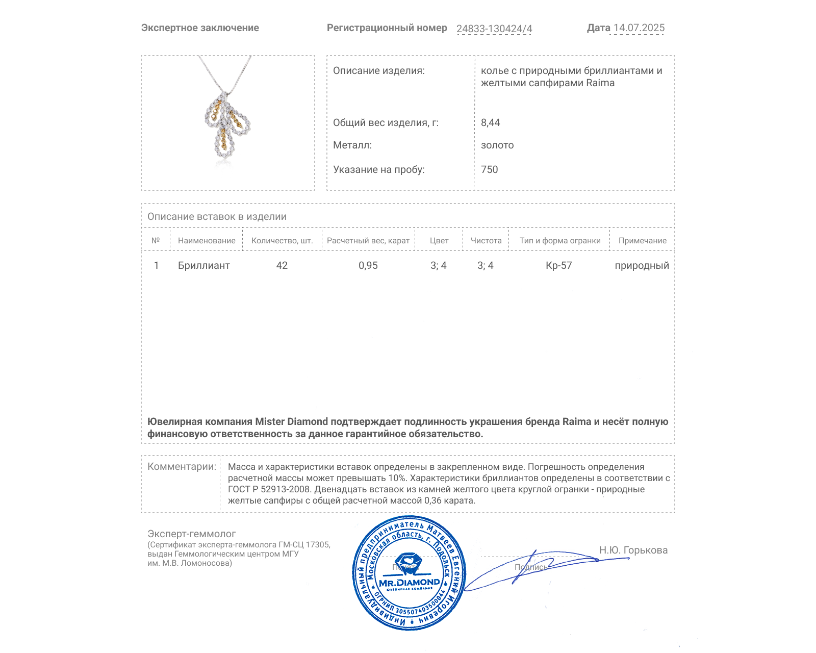 Представляем вашему вниманию оригинальное золотое колье с желтыми сапфирами 0.36ct и бриллиантами 0.95ct от всемирно известного бренда Raima.