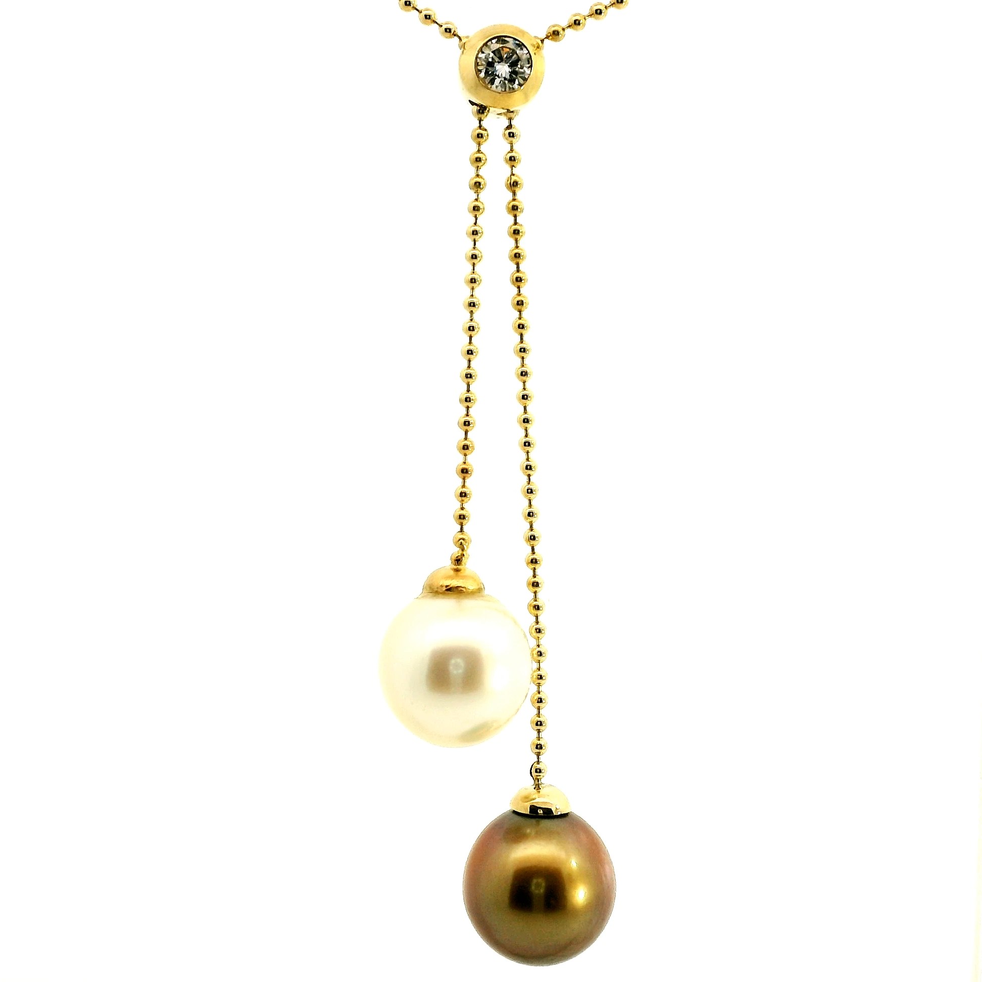 Представляем вашему вниманию оригинальное золотое колье с золотистым 10.20 мм и белым 10.10 мм жемчугом и бриллиантом 0.15ct от всемирно известного бренда Toni Gard.