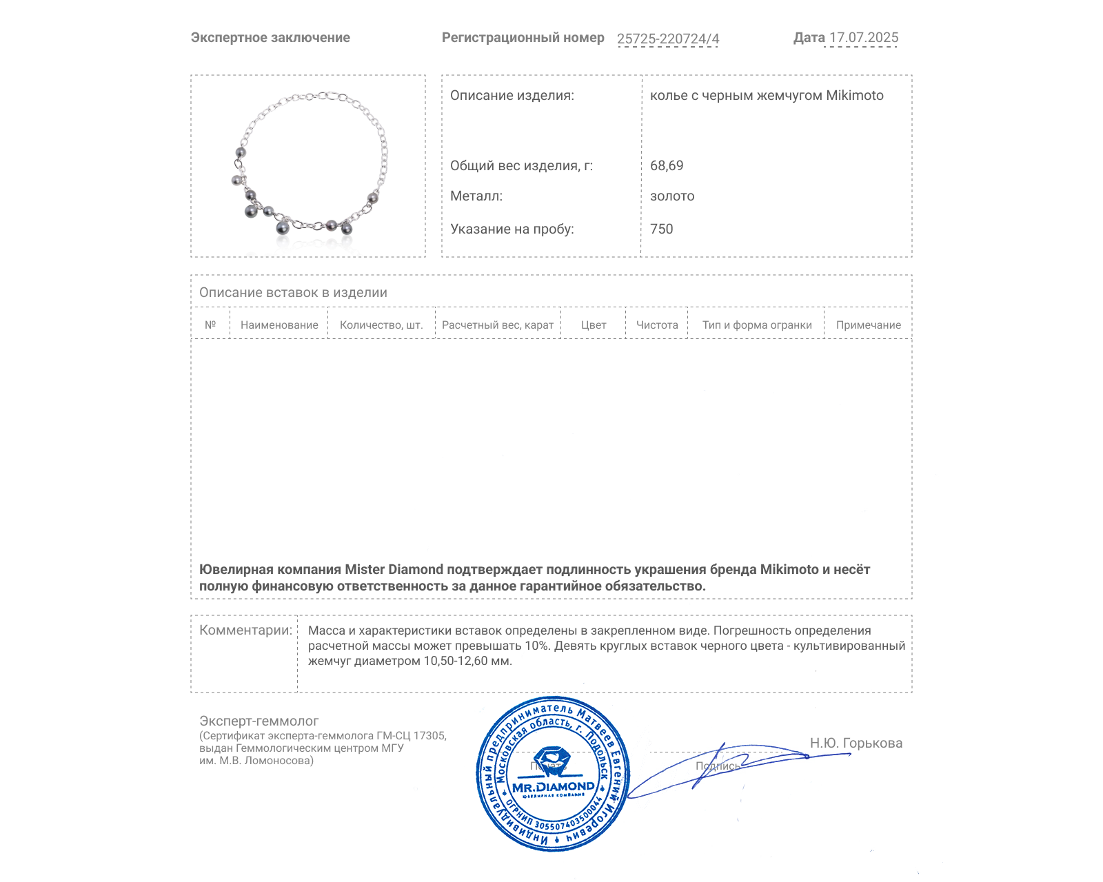 Представляем вашему вниманию оригинальное золотое колье с черным жемчугом 10.50-12.60 мм от всемирно известного бренда Mikimoto.