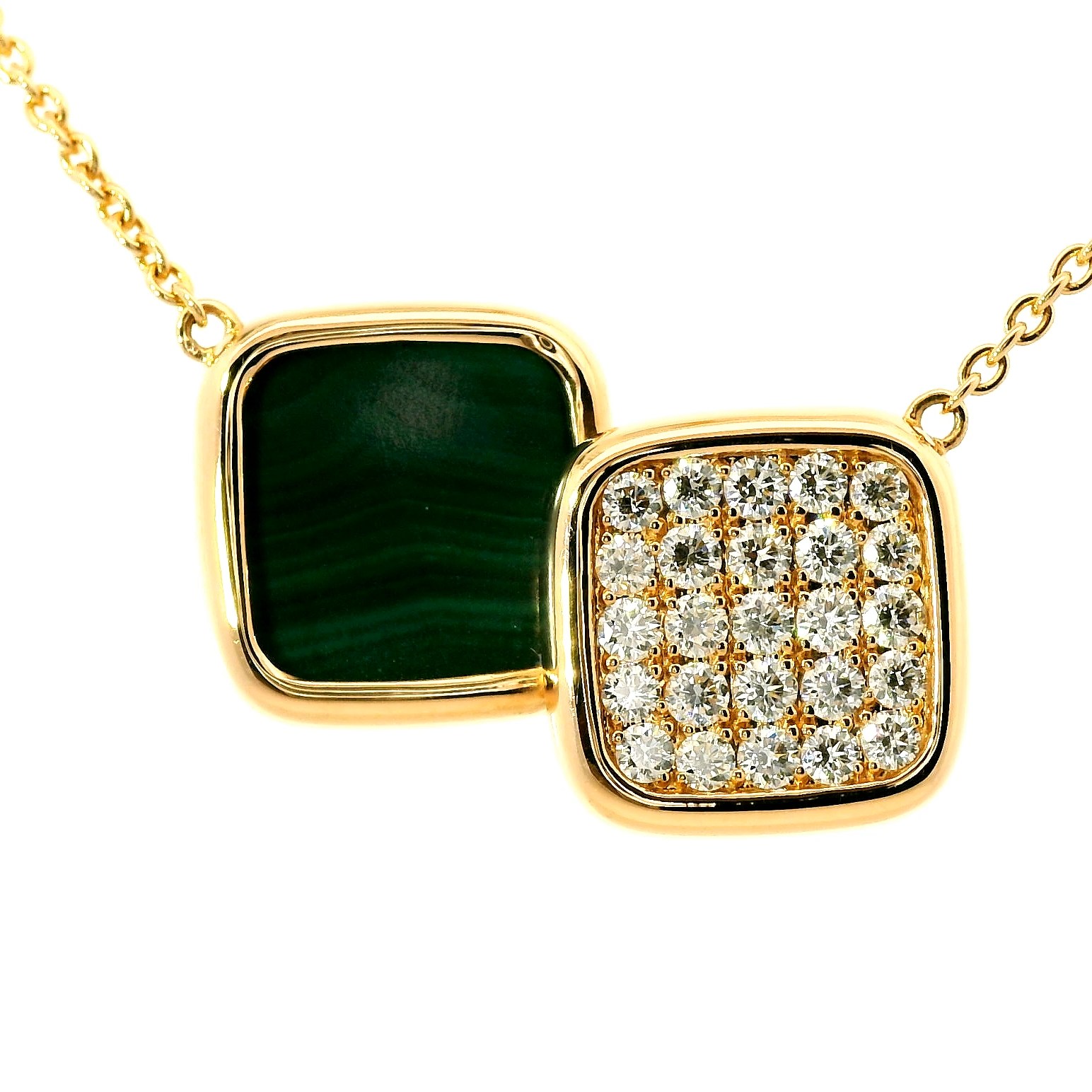 Элегантность в каждом цвете — оригинальное золотое колье Roberto Coin с малахитом, бриллиантами и рубином — это игра натуральных оттенков и сияния драгоценных камней. Два малахита общей массой 2.20 ct создают выразительный акцент, а 25 бриллиантов общей массой 0.45 ct добавляют мерцающую легкость. Нежный рубин завершает композицию, привнося тонкую нотку яркости.
