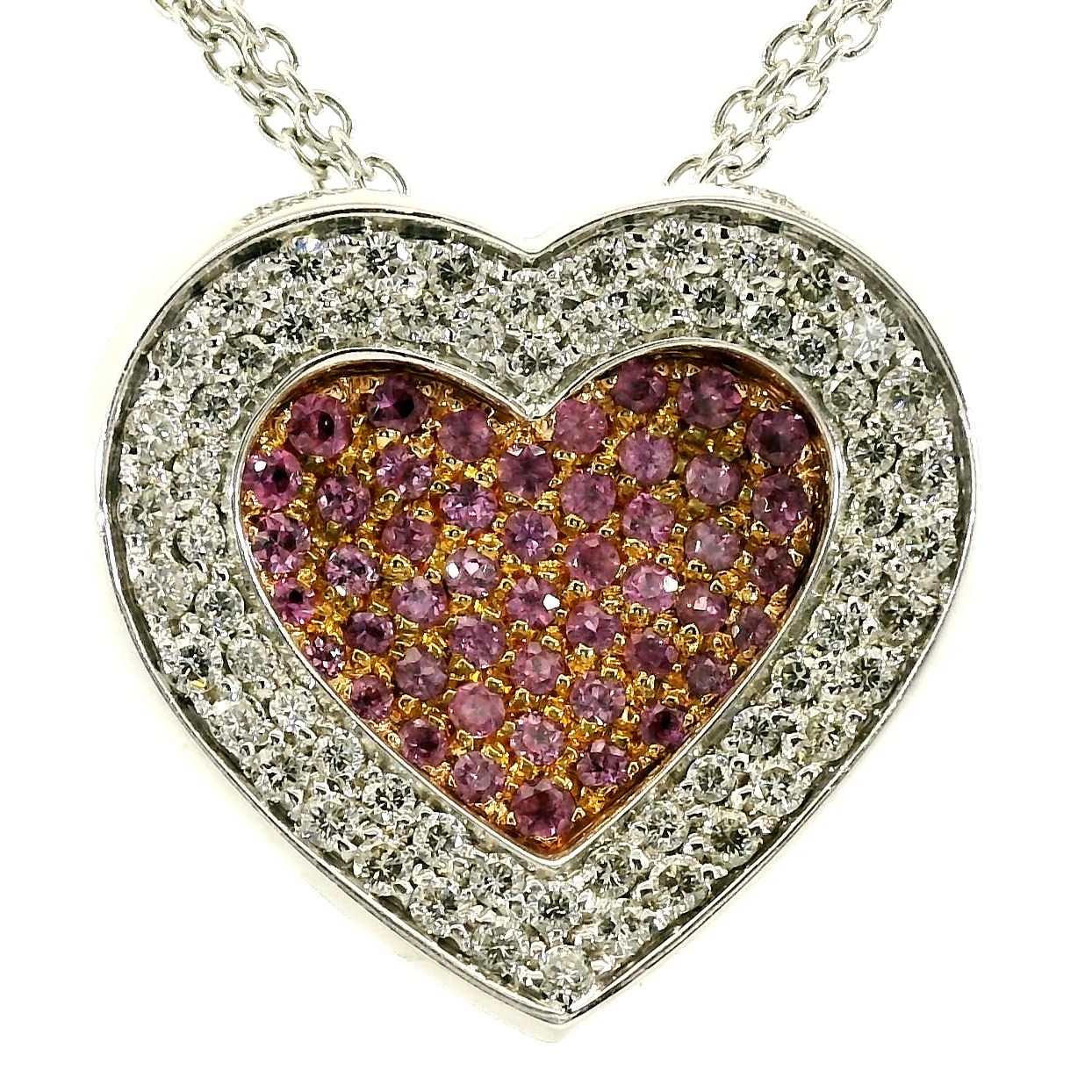 48 розовых сапфиров общей массой 0.86 ct дарят мягкое сияние, а 64 бриллианта общей массой 0.64 ct добавляют легкую искру, подчёркивая элегантность и женственность. Колье выполнено из золота 750 пробы, вес 14,6 г — лёгкое, но заметное украшение, которое подчёркивает статус и утончённый вкус.