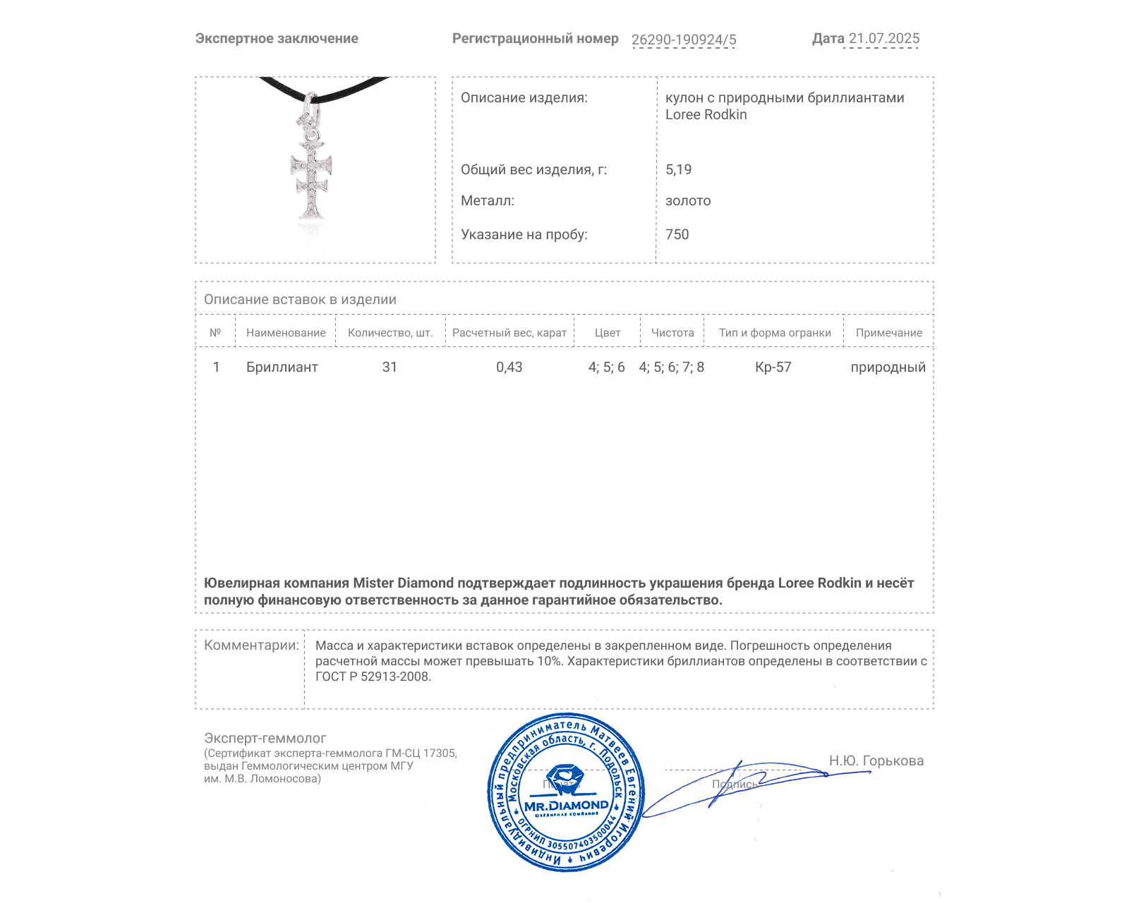 Представляем вашему вниманию оригинальную золотую подвеску с бриллиантами 0.43ct от всемирно известного бренда Loree Rodkin.