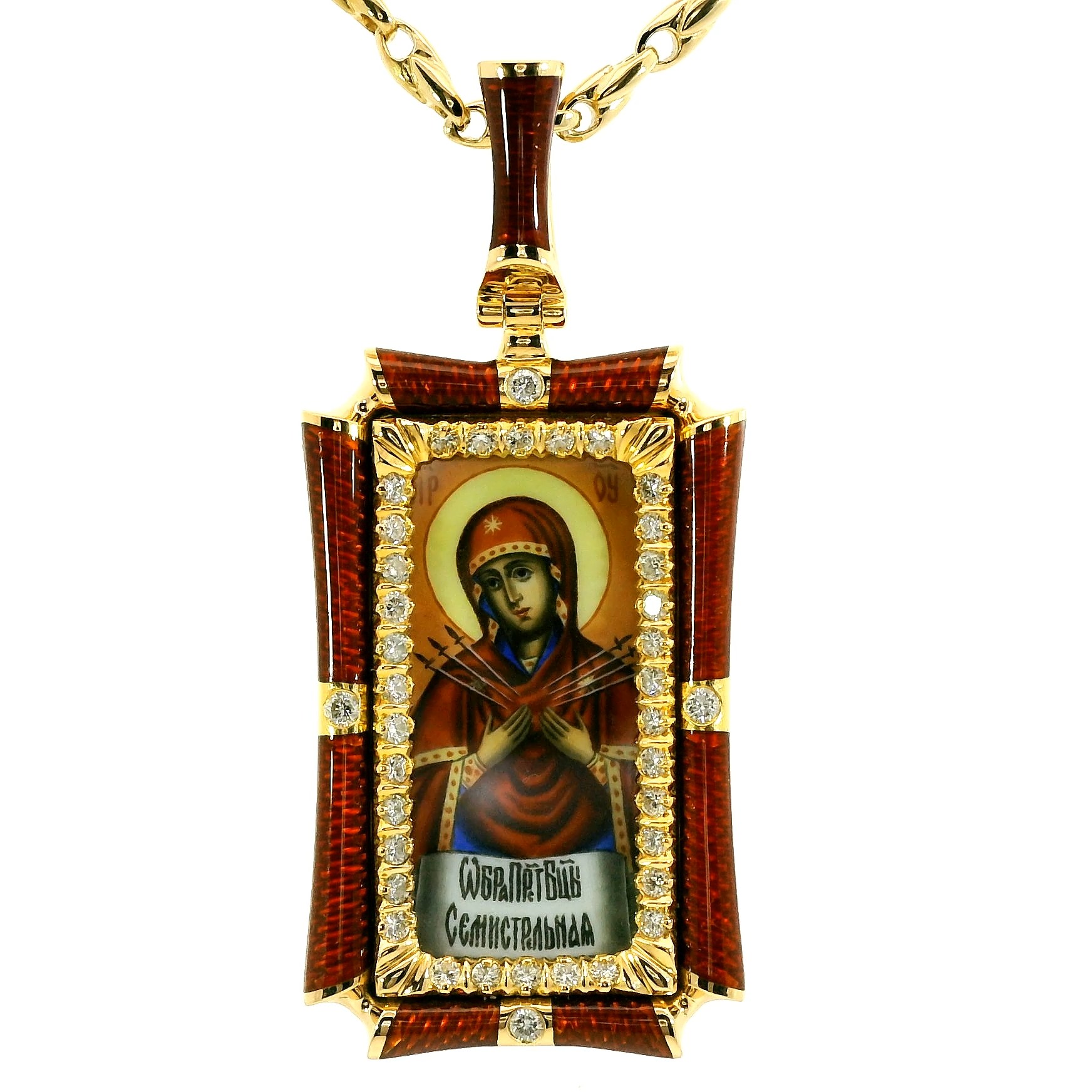 Представляем вашему вниманию оригинальную золотую подвеску икона Божьей Матери "Семистрельная" с эмалью и бриллиантами 0.43ct от всемирно известного бренда Skobelev.