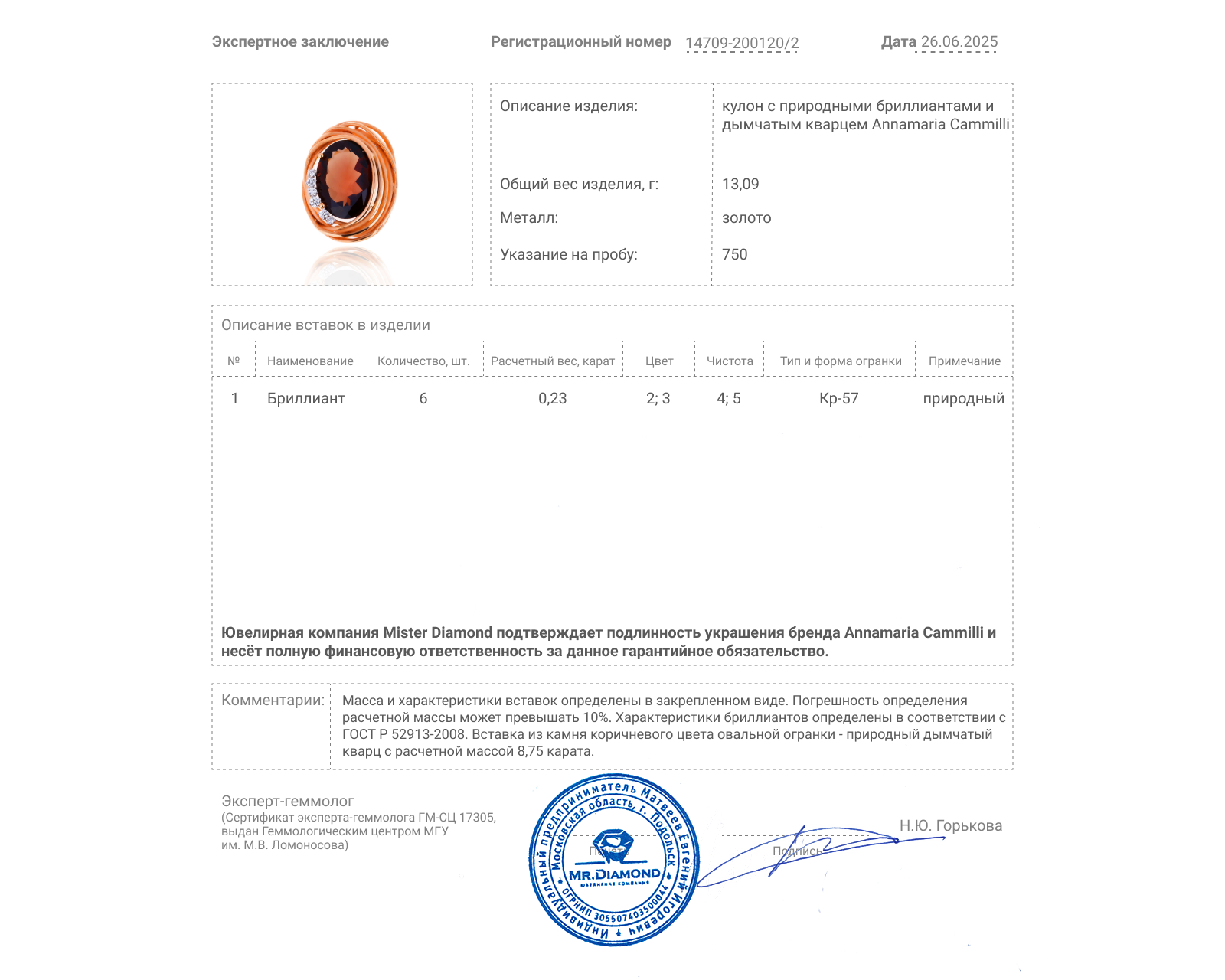 Представляем вашему вниманию оригинальную золотую подвеску с дымчатым кварцем 8.75ct и бриллиантами 0.23ct от всемирно известного бренда Annamaria Cammilli.