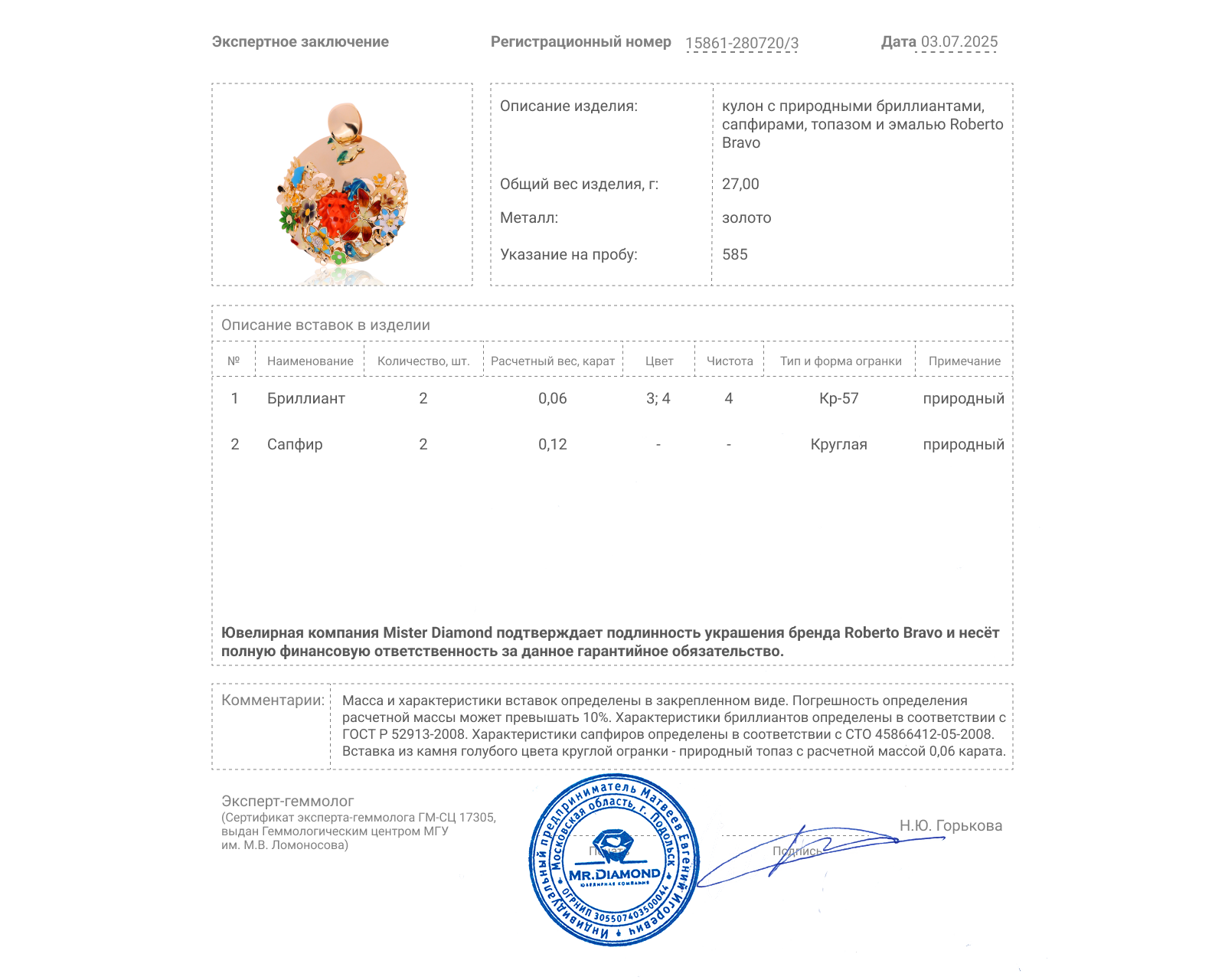 Представляем вашему вниманию оригинальную золотую подвеску с эмалью, кораллом, бриллиантами 0.06ct, сапфирами 0.12ct и топазом 0.06ct от всемирно известного бренда Roberto Bravo.