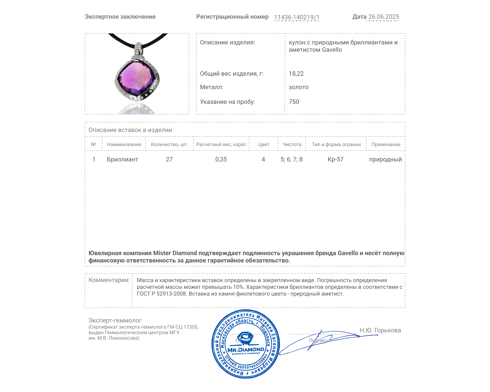 Представляем вашему вниманию оригинальный золотой кулон с бриллиантами 0.35ct и аметистами от всемирно известного бренда Gavello.