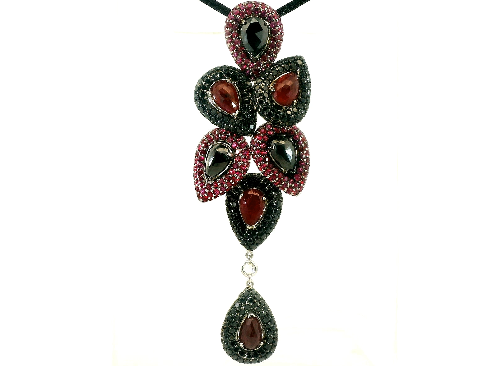 Представляем вашему вниманию золотую подвеску с рубинами 11.69ct и бесцветным 0.07ct и черными 14.90ct бриллиантами.