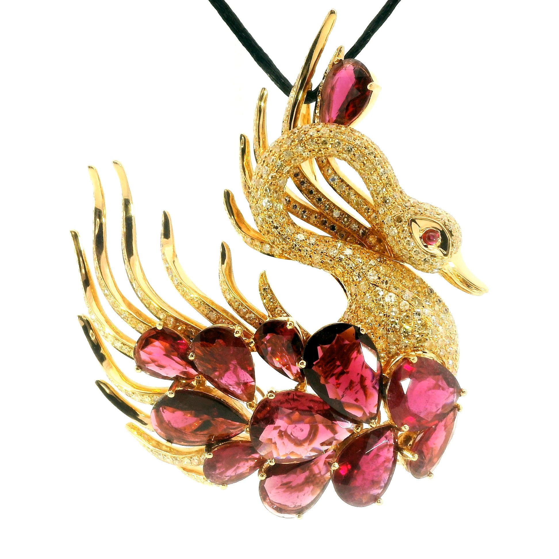 Представляем вашему вниманию золотую подвеску с турмалинами рубеллитами 18.20ct, рубином 0.02ct и бриллиантами 2.58ct.