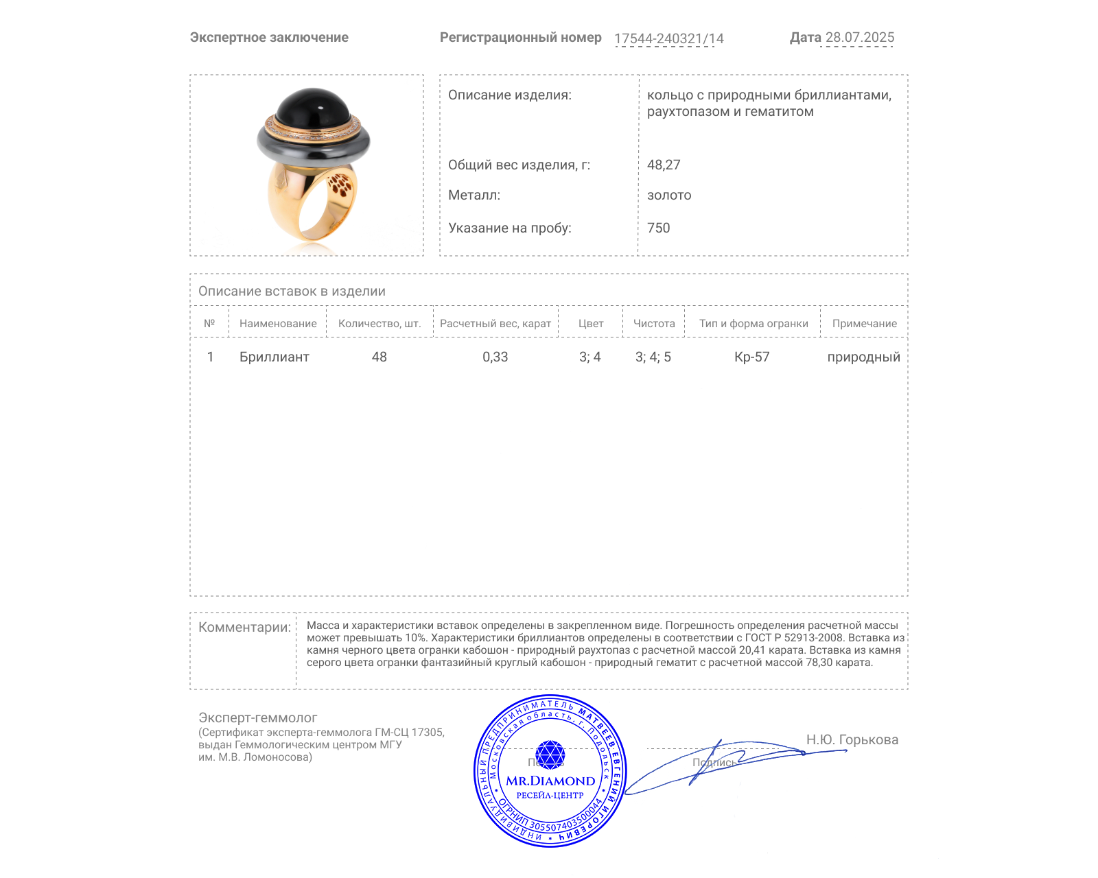 Безупречное золотое кольцо с раухтопазом 20.41ct — настоящее произведение искусства, в котором воплощено не только мастерство ювелира, но и актуальные тренды. Это доказательство вашего изысканного вкуса, высокого статуса и яркий акцент в стильном образе. Вставка — 1 кварц огранки "кабошон" 20.41ct, 48 бриллиантов круглой огранки 0.33ct 3/3-4/5, 1 гематит огранки "фантазийный круглый кабошон" 78.30ct, а обрамлением служит золото 750 пробы. Такое сочетание отлично смотрится и позволяет реализовывать самые необычные задумки вашего стиля. Размер ювелирного изделия — 18.5, бесплатно изменим на любой от 16.5 до 19.5, а общий вес — 48.27 г, и на пальце оно выглядит просто шикарно, сразу привлекая восхищенное внимание.