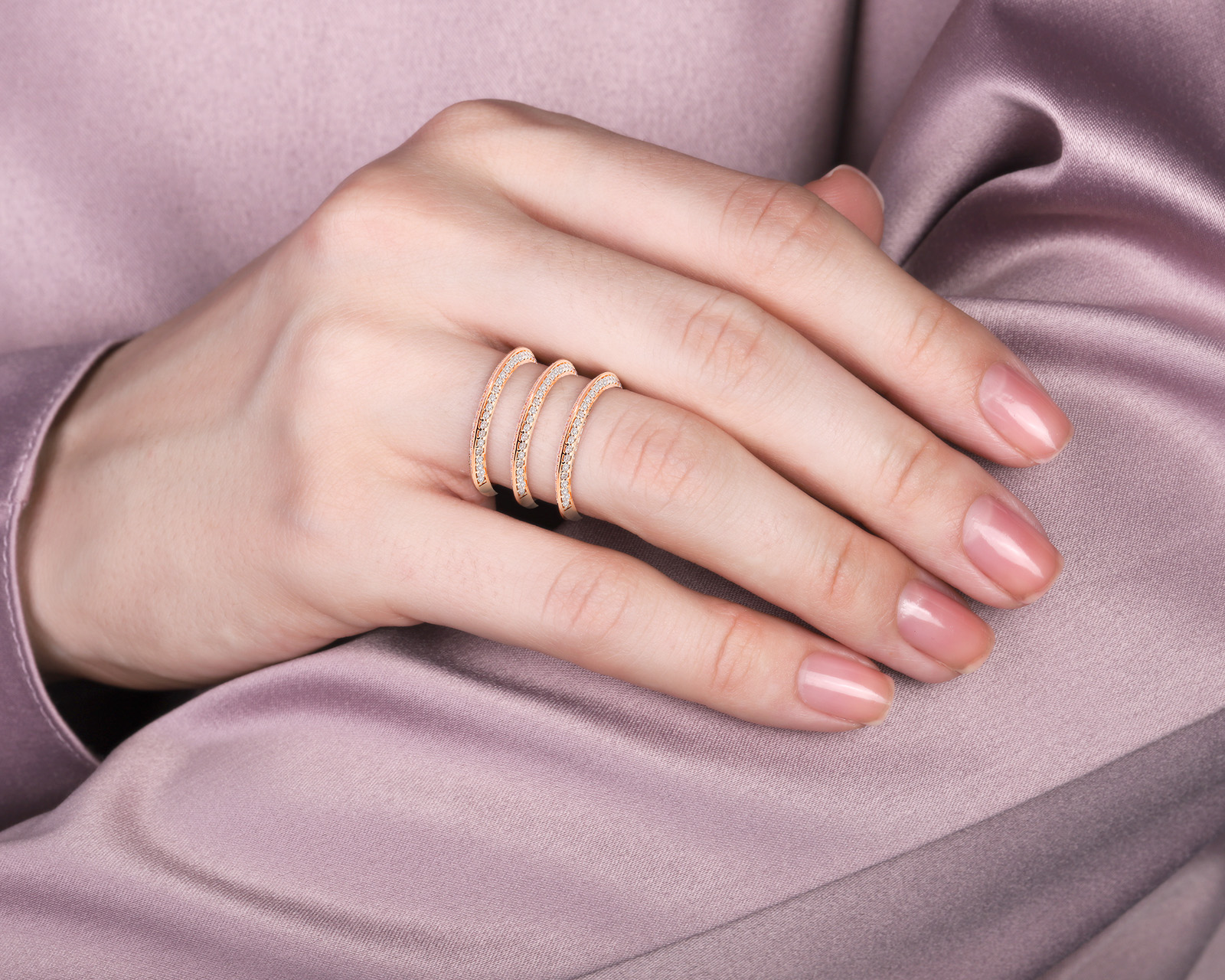 - изящные колечки с тонкой шинкой, дополненные бриллиантовым паве;