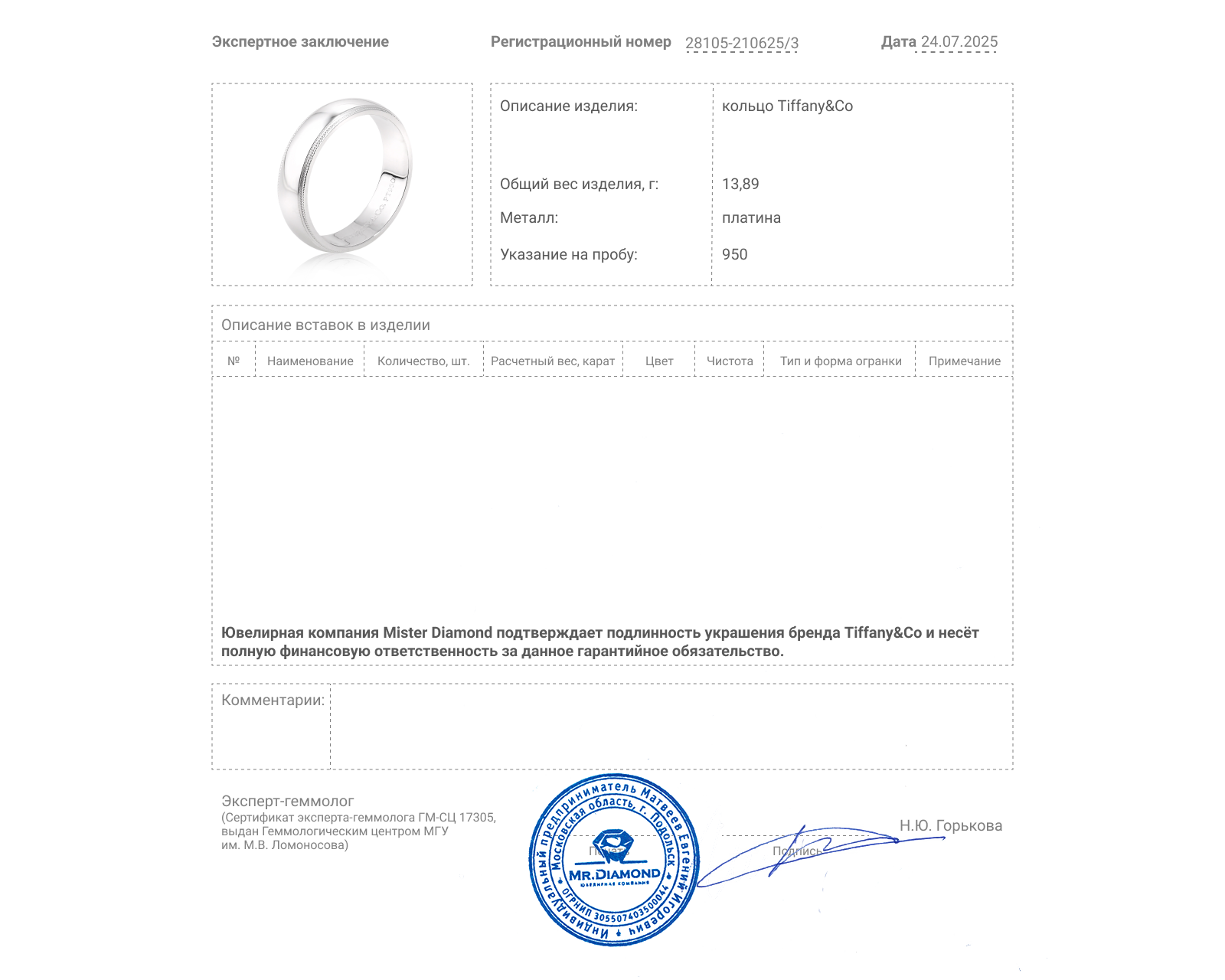 Оригинальное платиновое кольцо Tiffany&Co Milgrain — настоящее произведение искусства, в котором воплощено не только мастерство ювелира, но и актуальные тренды. Это доказательство вашего изысканного вкуса, высокого статуса и яркий акцент в стильном образе. Вставка — Ширина кольца: 6 мм., а обрамлением служит платина 950 пробы. Такое сочетание отлично смотрится и позволяет реализовывать самые необычные задумки вашего стиля. Размер ювелирного изделия — 20.75, а общий вес — 13.89 г, и на пальце оно выглядит просто шикарно, сразу привлекая восхищенное внимание.