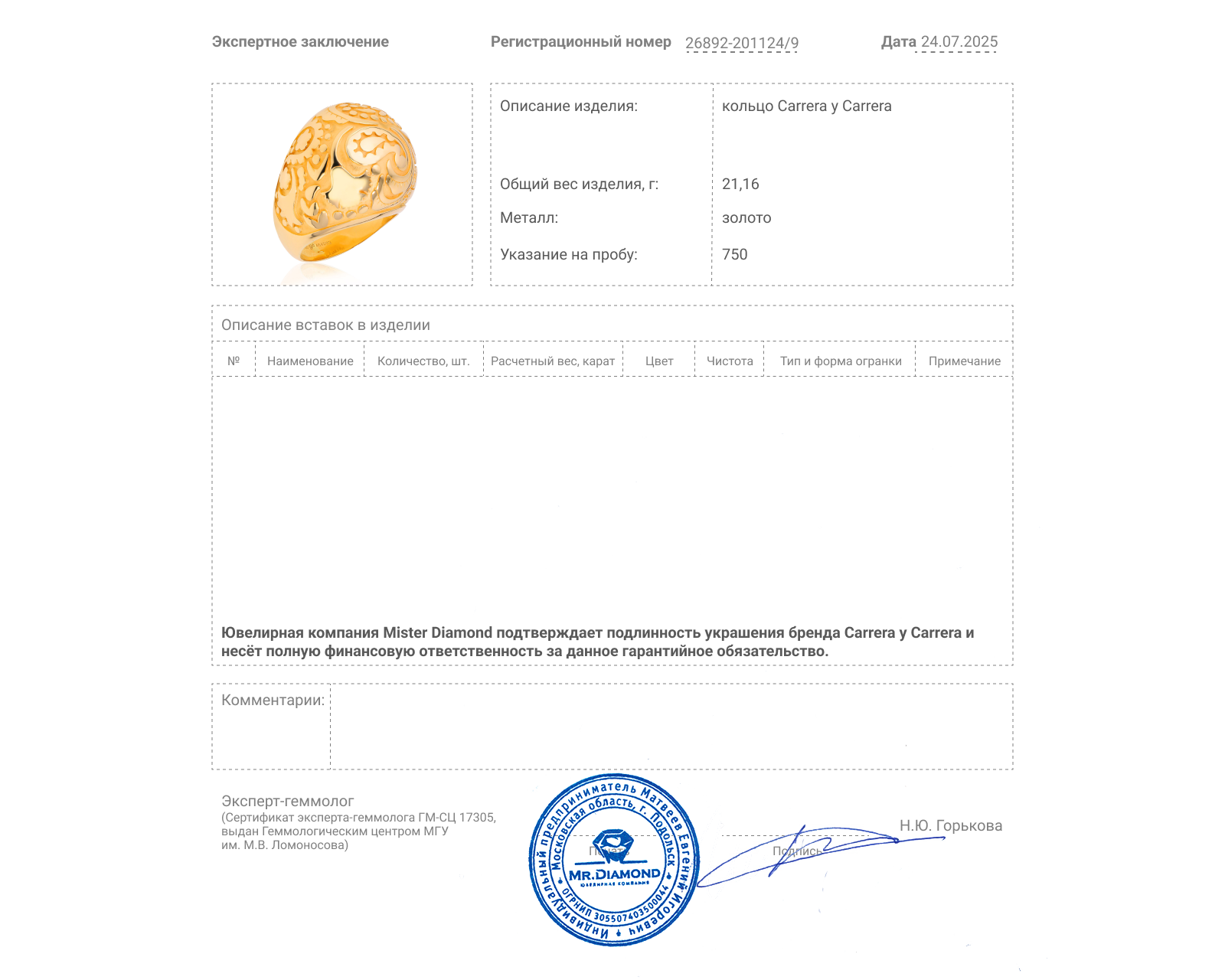 Оригинальное золотое кольцо Carrera y Carrera Aqua 080925/6