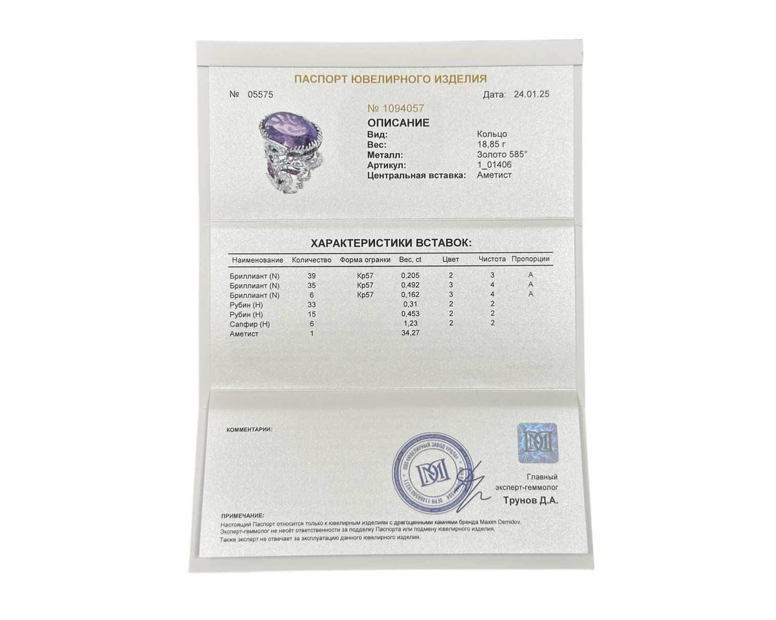 Оригинальное золотое кольцо с аметистом 22.34ct Maxim Demidov 280125/КМ151