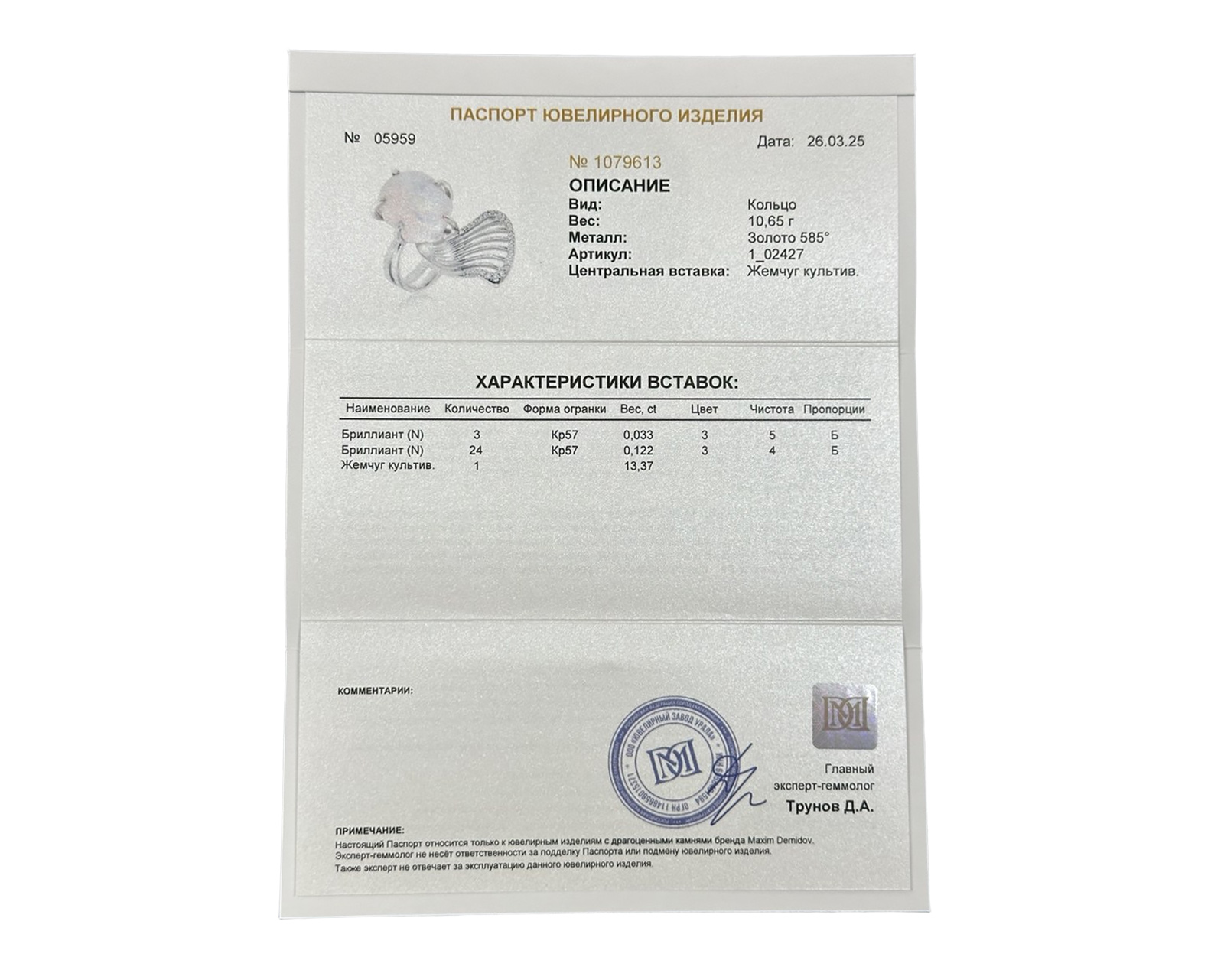 Оригинальное золотое кольцо с барочным жемчугом 13.37ct Maxim Demidov — настоящее произведение искусства, в котором воплощено не только мастерство ювелира, но и актуальные тренды. Это доказательство вашего изысканного вкуса, высокого статуса и яркий акцент в стильном образе. Вставка — 1 барочный жемчуг 13.37ct, 3 бриллианта круглой огранки 0.03ct 3/5, 24 бриллианта круглой огранки 0.12ct 3/4, Артикул производителя: 10796139, а обрамлением служит золото 585 пробы. Такое сочетание отлично смотрится и позволяет реализовывать самые необычные задумки вашего стиля. Размер ювелирного изделия — 18, бесплатно изменим на любой от 17 до 19.5, а общий вес — 10.65 г, и на пальце оно выглядит просто шикарно, сразу привлекая восхищенное внимание.