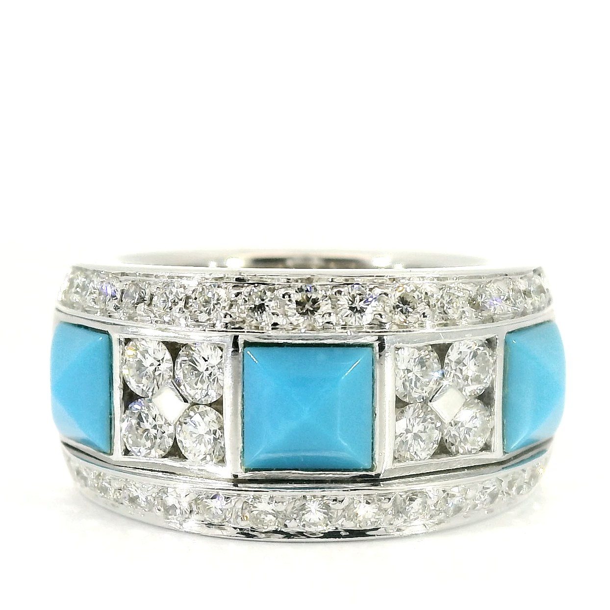 Оригинальное золотое кольцо с бирюзой 0.75ct Picchiotti — настоящее произведение искусства, в котором воплощено не только мастерство ювелира, но и актуальные тренды. Это доказательство вашего изысканного вкуса, высокого статуса и яркий акцент в стильном образе. Вставка — 3 бирюзы огранки "фантазийный кабошон" 0.75ct, 38 бриллиантов круглой огранки 1.04ct 3/3-3/4, а обрамлением служит золото 750 пробы. Такое сочетание отлично смотрится и позволяет реализовывать самые необычные задумки вашего стиля. Размер ювелирного изделия — 16.75, а общий вес — 20.26 г, и на пальце оно выглядит просто шикарно, сразу привлекая восхищенное внимание.
