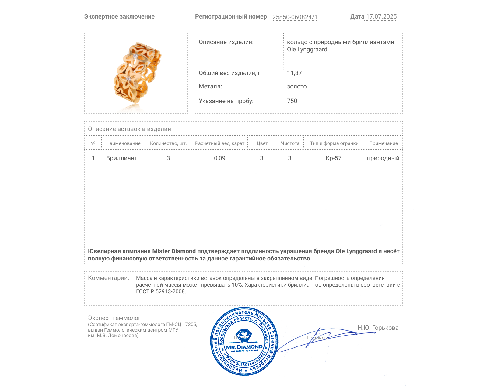 Оригинальное золотое кольцо с бриллиантами 0.09ct Ole Lynggraard — настоящее произведение искусства, в котором воплощено не только мастерство ювелира, но и актуальные тренды. Это доказательство вашего изысканного вкуса, высокого статуса и яркий акцент в стильном образе. Вставка — 3 бриллианта круглой огранки 0.09ct 3/3, а обрамлением служит золото 750 пробы. Такое сочетание отлично смотрится и позволяет реализовывать самые необычные задумки вашего стиля. Размер ювелирного изделия — 17, а общий вес — 11.87 г, и на пальце оно выглядит просто шикарно, сразу привлекая восхищенное внимание.