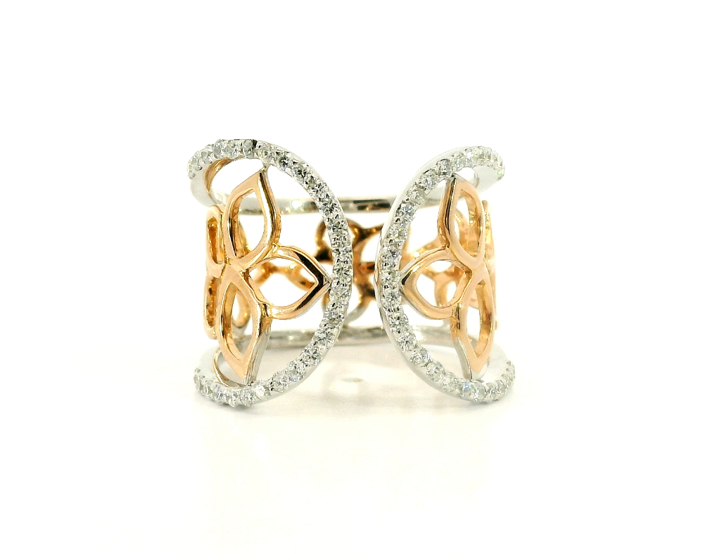 Оригинальное золотое кольцо с бриллиантами 0.44ct Korloff — настоящее произведение искусства, в котором воплощено не только мастерство ювелира, но и актуальные тренды. Это доказательство вашего изысканного вкуса, высокого статуса и яркий акцент в стильном образе. Вставка — 54 бриллианта круглой огранки 0.44ct 3/4-3/5, а обрамлением служит золото 750 пробы. Такое сочетание отлично смотрится и позволяет реализовывать самые необычные задумки вашего стиля. Размер ювелирного изделия — 16.5, бесплатно изменим на любой от 16 до 17, а общий вес — 5.18 г, и на пальце оно выглядит просто шикарно, сразу привлекая восхищенное внимание.