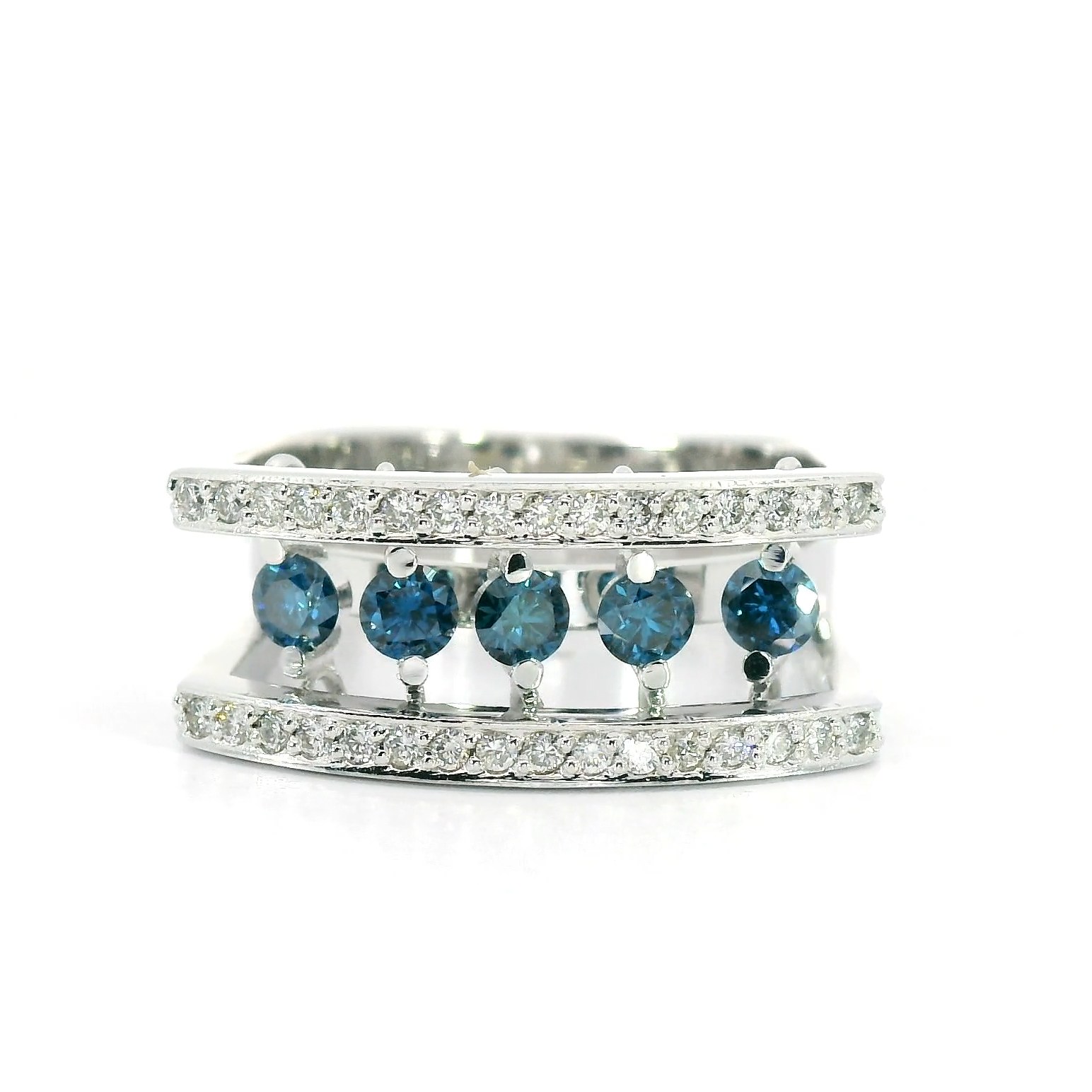 Оригинальное золотое кольцо с бриллиантами 0.72ct Roberto Bravo Salsa — настоящее произведение искусства, в котором воплощено не только мастерство ювелира, но и актуальные тренды. Это доказательство вашего изысканного вкуса, высокого статуса и яркий акцент в стильном образе. Вставка — 5 бриллиантов круглой огранки 0.43ct blue/5-blue/6, 44 бриллианта круглой огранки 0.29ct 3/4-4/5, а обрамлением служит золото 750 пробы. Такое сочетание отлично смотрится и позволяет реализовывать самые необычные задумки вашего стиля. Размер ювелирного изделия — 16.25, бесплатно изменим на любой от 15.75 до 16.75, а общий вес — 6.47 г, и на пальце оно выглядит просто шикарно, сразу привлекая восхищенное внимание.