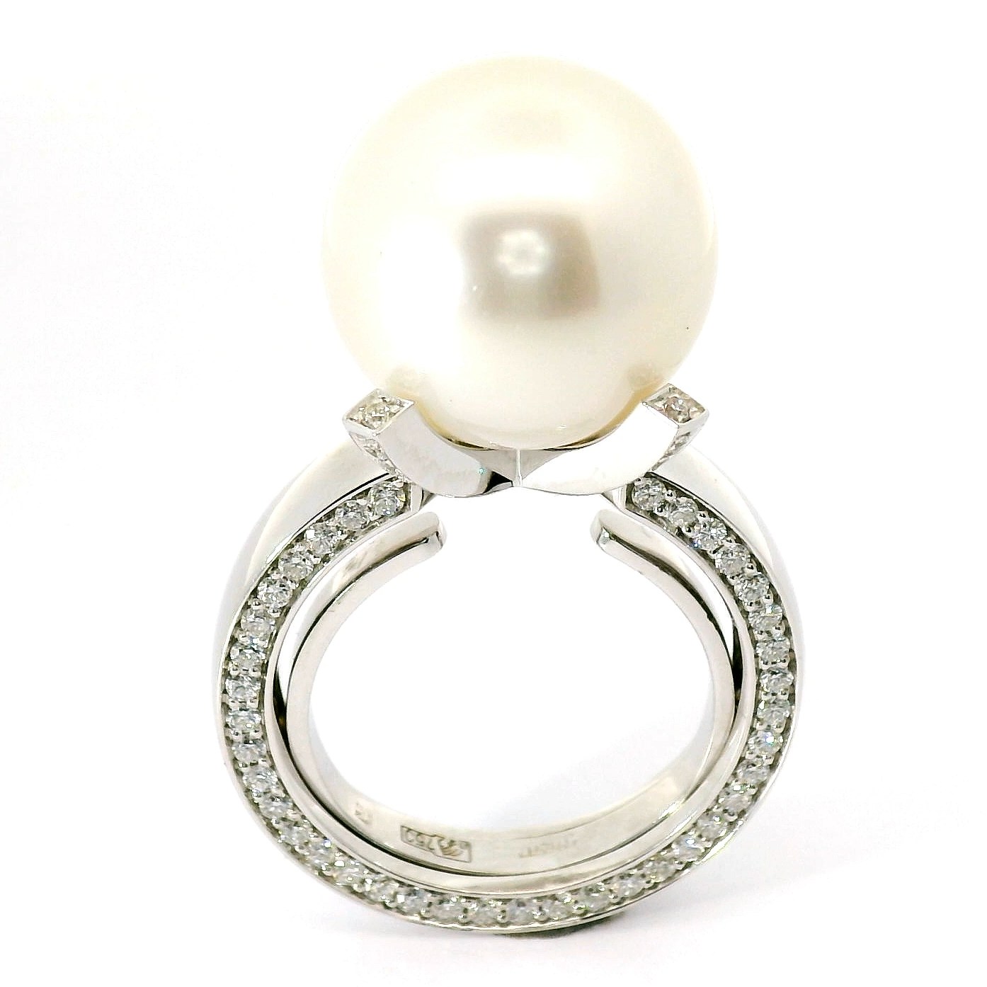 Оригинальное золотое кольцо с бриллиантами 0.75ct SORA by Ksenia Podnebesnaya — настоящее произведение искусства, в котором воплощено не только мастерство ювелира, но и актуальные тренды. Это доказательство вашего изысканного вкуса, высокого статуса и яркий акцент в стильном образе. Вставка — 1 морской жемчуг 14.10-14.20 мм, 100 бриллиантов круглой огранки 0.75ct 3/4-4/5, а обрамлением служит золото 750 пробы. Такое сочетание отлично смотрится и позволяет реализовывать самые необычные задумки вашего стиля. Размер ювелирного изделия — 16, а общий вес — 11.7 г, и на пальце оно выглядит просто шикарно, сразу привлекая восхищенное внимание.